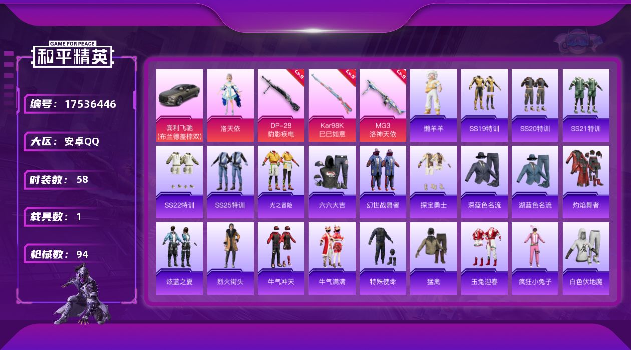 [17536446]安卓 手Q-1粉装-4特效枪-1载具-1粉色飞行器-23920热力值-2王牌印记-58套装-94枪皮【粉色套装】:角色-洛天依【粉色枪皮等级】:Kar98K-巳巳如意(五级),Mk14-福马献瑞(一级),DP-28-豹影疾电(五级),MG3-洛神天依(五级)【粉色载具】:宾利飞驰(布罗德盖棕双色)【粉色枪皮】:Kar98K-巳巳如意,Mk14-福马献瑞,DP-28-豹影疾电,MG3-洛神天依【粉色飞行器】:炫彩糖果飞行器