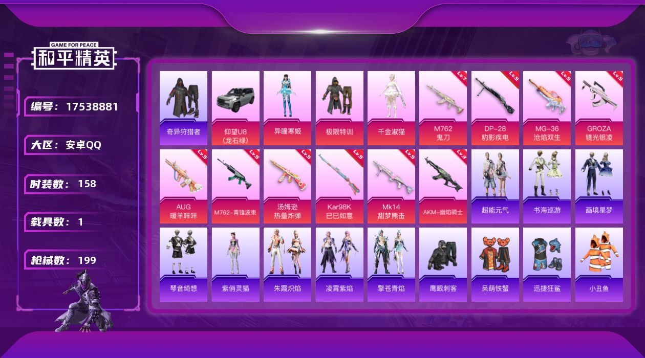 [17538881]安卓 手Q-3粉装-13特效枪-1载具-2粉色飞行器-58769热力值-9王牌印记-158套装-199枪皮