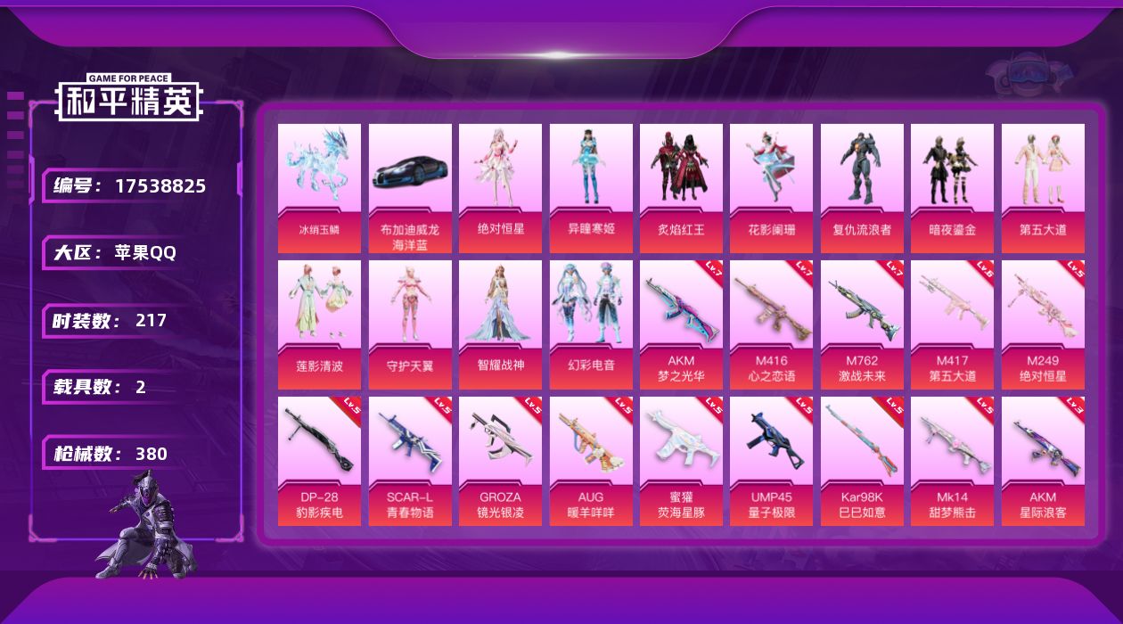 苹果 手Q-无敌战神框-11粉装-19特效枪-2载具-16粉色飞行器-117551热力值-21王牌印记-217套装-380枪皮