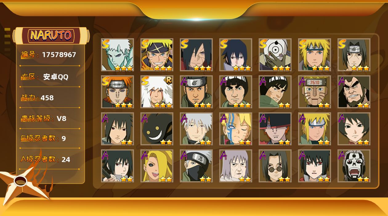 【S级忍者】:宇智波斑「秽土转生·解」(3星),宇智波鼬「须佐能乎」(3星),自来也「舞之豪杰」(3星),波风水门(3星),佩恩「天道」(3星),宇智波佐助「永恒万花筒」(3星),宇智波斑 「白面具」(3星宇智波斑「白面具」),漩涡鸣人·宇智波佐助(3星),宇智波带土「十尾人柱力」(3星)