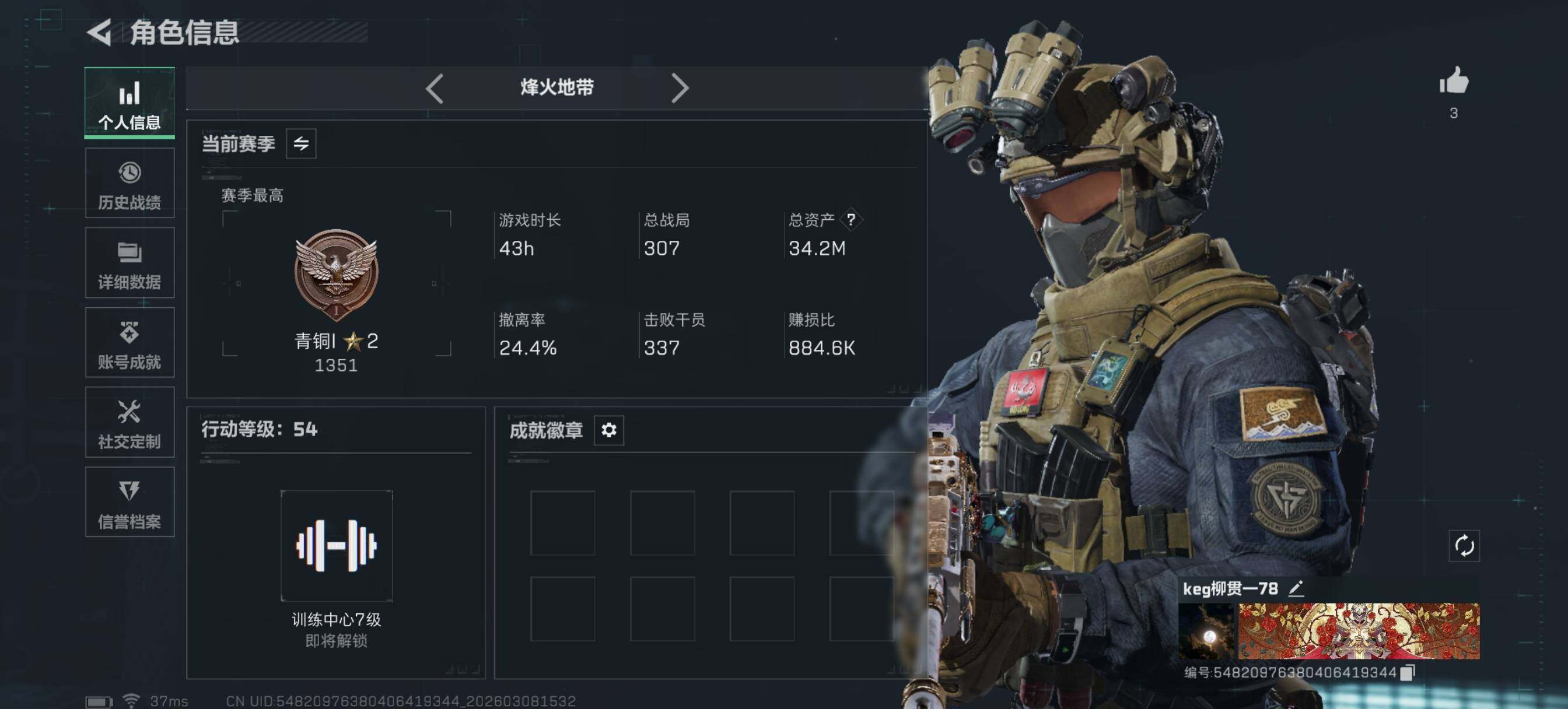 [17579040]【特价出售/店主推荐】34m总资产-7642k哈伏币-54烽火等级-青铜-1战场等级-无军衔