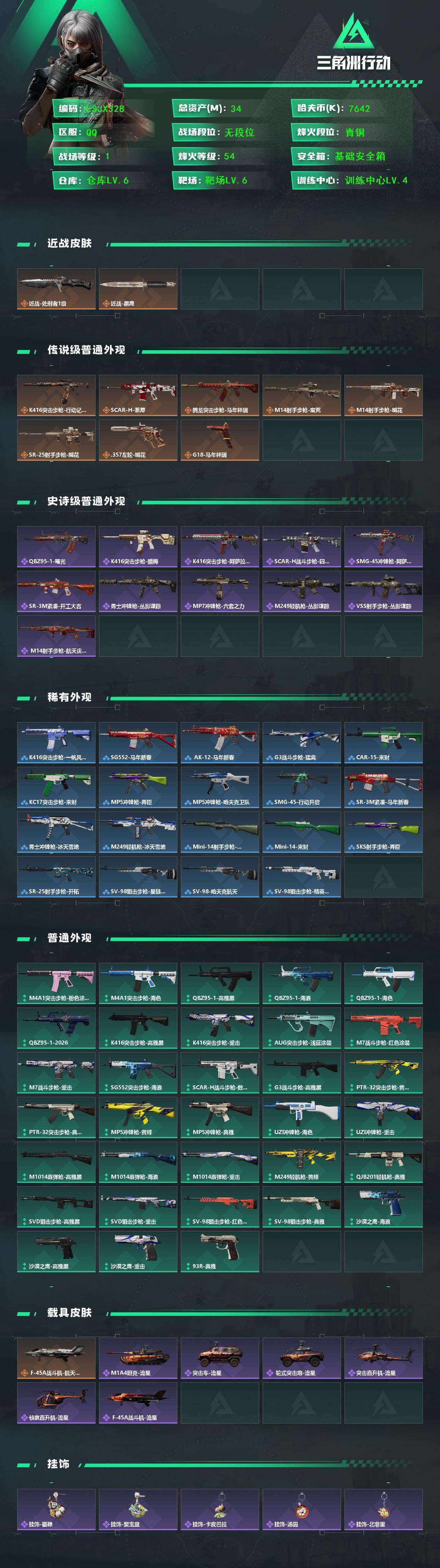 [17579040]【特价出售/店主推荐】34m总资产-7642k哈伏币-54烽火等级-青铜-1战场等级-无军衔 【近战皮肤】:近战-处刑者1级,近战-黑鹰 【传说外观】:K416突击步枪-行动记录,SCAR-H战斗步枪-荼蘼,腾龙突击步枪-马年祥瑞,M14射手步枪-蛮荒,M14射手步枪-缄花,SR-25射手步枪-缄花,.357左轮-缄花,G18-马年祥瑞 【史诗外观】:QBZ95-1突击步枪-曙光,K416突击步枪-腊梅,K416突击步枪-阿萨拉特攻,SCAR-H战斗步枪-囚徒,SMG-45冲锋枪-阿萨拉特攻,SR-3M紧凑突击步枪-开工大吉,勇士冲锋枪-丛影谍踪,MP7冲锋枪-六套之力,M249轻机枪-丛影谍踪,VSS射手步枪-丛影谍踪, M14射手步枪-航天庆典 【稀有外观】:K416突击步枪-一帆风顺,SG552突击步枪-马年新春, AK-12突击步枪-马年新春,G3战斗步枪-猛禽,CAR-15突击步枪-来财,KC17突击步枪-来财,MP5冲锋枪-弄臣,MP5冲锋枪-哈夫克卫队,SMG-45冲锋枪-行动开启,SR-3M紧凑突击步枪-马年新春,勇士冲锋枪-冰天雪地,M249轻机枪-冰天雪地,Mini-14射手步枪-荣耀列队,Mini-14射手步枪-来财,SKS射手步枪-弄臣,SR-25射手步枪-开拓,SV-98狙击步枪-星链科技,SV-98狙击步枪-哈夫克航天,SV-98狙击步枪-精英联盟,QSZ92G-一帆风顺 【普通外观】:M4A1突击步枪-粉色涂装,M4A1突击步枪-海色,QBZ95-1突击步枪-高雅黑,QBZ95-1突击步枪-海浪,QBZ95-1突击步枪-海色,QBZ95-1突击步枪-2026,K416突击步枪-高雅黑,K416突击步枪-重击,AUG突击步枪-浅蓝涂装,M7战斗步枪-红色涂装,M7战斗步枪-重击,M7战斗步枪-黑巧甜心,SG552突击步枪-海浪,SG552突击步枪-狂欢,SCAR-H战斗步枪-数码迷彩,G3战斗步枪-高雅黑,PTR-32突击步枪-黄蜂,PTR-32突击步枪-典雅,CAR-15突击步枪-狂欢,AS Val突击步枪-黑巧甜心,MP5冲锋枪-黄蜂,MP5冲锋枪-典雅,P90冲锋枪-黑巧甜心,UZI冲锋枪-海色,UZI冲锋枪-重击,UZI冲锋枪-狂欢,M1014霰弹枪-高雅黑,M1014霰弹枪-海浪,M1014霰弹枪-重击,M249轻机枪-黄蜂,