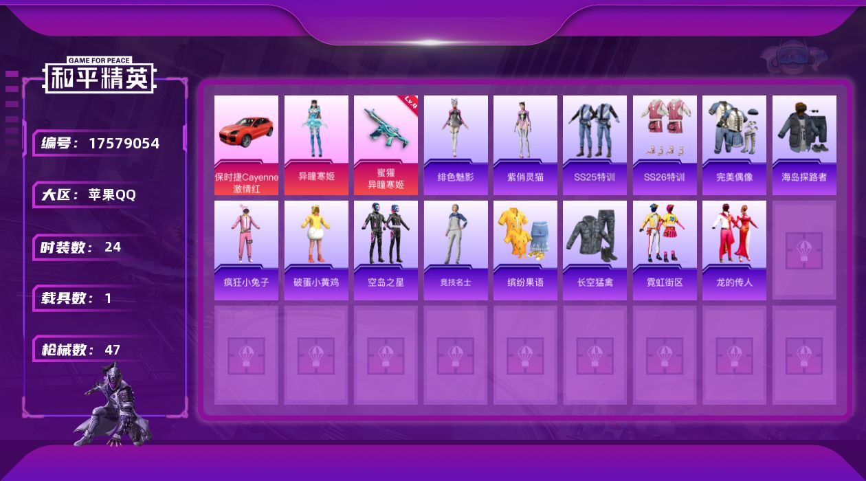 [17579054]【店主推荐捡漏号!可直接换绑】苹果 手Q-1粉装-2特效枪-1载具-1粉色飞行器-13338热力值-3王牌印记-24套装-47枪皮【粉色套装】:角色-异瞳寒姬【粉色枪皮等级】:蜜獾-异瞳寒姬(四级),PKM-萌骑夺宝(二级)【粉色载具】:保时捷Cayenne(激情红)【粉色枪皮】:蜜獾-异瞳寒姬,PKM-萌骑夺宝【粉色飞行器】:炫彩糖果飞行器