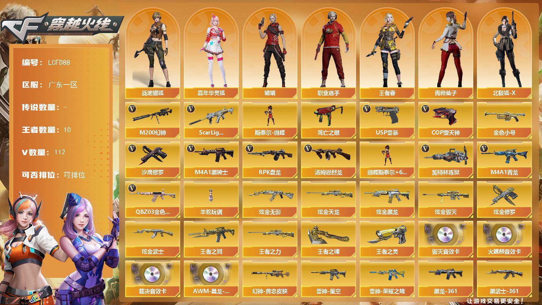 [17579405]广东一区-118V-10王者武器数-8炫金武器数 【热门武器】:QBZ03-金色蔷薇,Scar Light-白虎,M4A1-青龙,M200-幻神,死亡之眼*2,金色小号,M4A1-黑骑士*3,汤姆逊-烈龙*8,RPK-盘龙*3,加特林-炼狱*2,斯泰尔-蝴蝶,羊驼玩偶,USP-雷暴,COP-堕天神,沙鹰-修罗*3 【王者炫金武器】:王者之戮,王者之力,王者之灵,王者之啸,炫金无影*2,炫金黑龙,炫金武士,炫金毁灭*2,炫金天龙,炫金修罗 【音效卡】:AK47-火麒麟音效卡,Barrett-毁灭音效卡,AWM-裁决音效卡,AWM-昌龙-怀旧音效卡*2 【皮肤】:M200-幻神-黄忠皮肤,雷神-荣耀之魄,雷神-星空,雷神-源计划2.0专属 皮肤,火麒麟-华夏之心,毁灭-星空,毁灭-BEAN-2020MVP,M4A1-黑龙-361,AK47-黑武士-361,战神-粉色甜心皮肤,战神-紫绶金章皮肤,战神-流金岁月皮肤,AK47-B-常胜将军-曹操*2,AK47-B-常胜将军-刘备,天龙-能量核心,AWM-天龙-传奇70KG,AWM-天龙-传奇白鲨 【角色】:零,樱,魅影,战地猎狐,王者-葵-貂蝉,王者春,暗夜-X,北极狐-X,风暴女,嘉年华灵狐,娟娟,灵狐者-黄金海岸,潘多拉-X,潜龙队-X,青霞仙子,铁骑荣耀,雪莉杨,影武者-X,职业选手 【人偶武器】:天龙-曼陀罗,火麒麟-灵狐,斯泰尔-蝴蝶,AWM-灵狐-15周年嘉年华,M37-葵,迷你深渊冰龙,迷你生化手雷,闪光弹-小乔,闪光弹-貂蝉,高爆手雷-大乔 【暴走生化】:黑龙吞噬者,死亡之眼*2,超级对讲机 【挑战大师】:神圣爆裂者III,AK47-冰龙粉碎者,VEPR-12-金魔,阐释者III 【英雄级武器】:M4A1-千变,AK47-火麒麟*2,M4A1-黑龙*2,M4A1-雷神,M4A1-黑骑士*3,M4A1-死神,AK47-黑武士*3,AN94-超新星*2,M4A1-武圣*2,AK47-黑鲨*3,M4A1-青龙,Scar Light-白虎,M4A1-玫瑰精灵,QBZ03-金色蔷薇,M4A1-猎神*2,9A91-烈火*4,王者之心-觉醒版,王者之魄-觉醒版,王者之幻-觉醒版,AK47-B-战神,AK47-B-常胜将军,AK47-B-身先士卒,AK47-B-战士*2,AWM-天龙,Barrett-毁灭*3,Barre