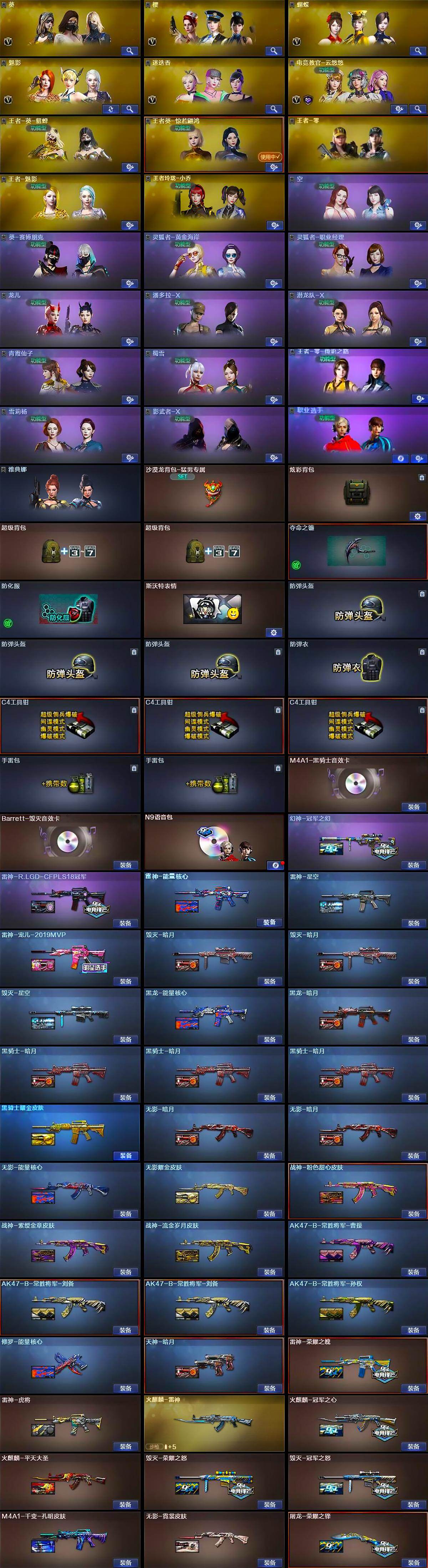 【皮肤】:幻神-冠军之幻,雷神-能量核心,雷神-荣耀之魄,雷神-星空,雷神-虎将,雷神-宠儿-2019MVP,雷神-R.LGD-CFPLS18冠军,火麒麟-雷神,火麒麟-冠军之心,火麒麟-平天大圣,毁灭-暗月*2,毁灭-荣耀之怒,毁灭-星空,毁灭-冠军之怒,M4A1-千变-孔明皮肤,黑龙-能量核心,黑龙-暗月,黑骑士-暗月*3,黑骑士耀金皮肤,无影-暗月*2,无影-能量核心,无影耀金皮肤,无影-霓裳皮肤,战神-粉色甜心皮肤,战神-紫绶金章皮肤,战神-流金岁月皮肤,AK47-B-常胜将军-曹操,AK47-B-常胜将军-刘备*2,AK47-B-常胜将军-孙权,修罗-能量核心,天神-暗月,屠龙-荣耀之锋