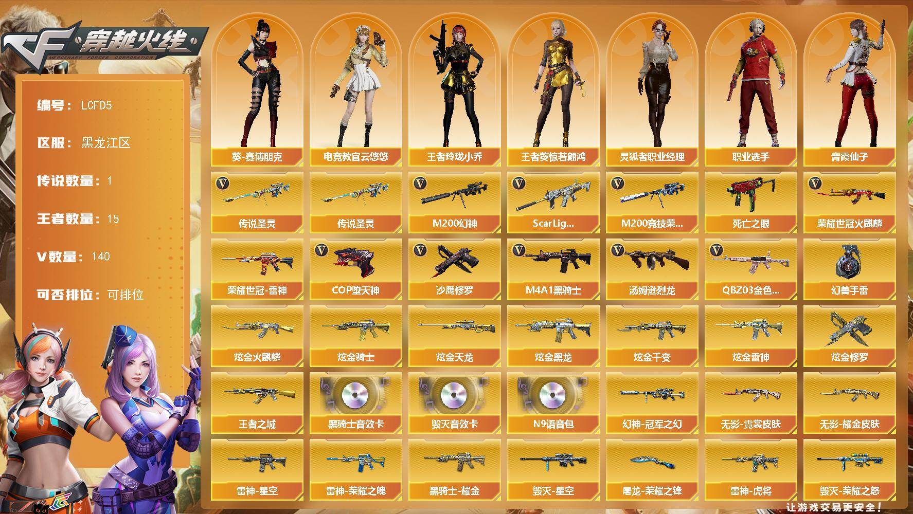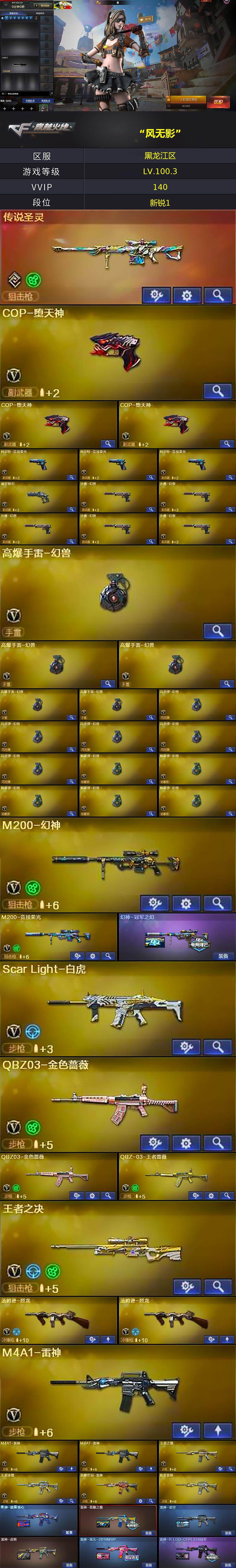 [17580301]1传说 黑龙江区-154V-15王者武器数-8炫金武器数 【传说武器】:传说圣灵 【热门武器】:传说圣灵,QBZ03-金色蔷薇*2,Scar Light-白虎,M200-幻神,M200-竞技荣光,死亡之眼,荣耀世冠-火麒麟,荣耀世冠-雷神,M4A1-黑骑士*5,汤姆逊-烈龙*2,COP-堕天神*3,沙鹰-修罗*2,高爆手雷-幻兽*5 【王者炫金武器】:王者之城,炫金火麒麟*2,炫金骑士,炫金黑龙,炫金千变,炫金雷神,炫金天龙,炫金修罗 【音效卡】:M4A1-黑骑士音效卡,Barrett-毁灭音效卡,N9语音包 【皮肤】:幻神-冠军之幻,雷神-能量核心,雷神-荣耀之魄,雷神-星空,雷神-虎将,雷神-宠儿-2019MVP,雷神-R.LGD-CFPLS18冠军,火麒麟-雷神,火麒麟-冠军之心,火麒麟-平天大圣,毁灭-暗月*2,毁灭-荣耀之怒,毁灭-星空,毁灭-冠军之怒,M4A1-千变-孔明皮肤,黑龙-能量核心,黑龙-暗月,黑骑士-暗月*3,黑骑士耀金皮肤,无影-暗月*2,无影-能量核心,无影耀金皮肤,无影-霓裳皮肤,战神-粉色甜心皮肤,战神-紫绶金章皮肤,战神-流金岁月皮肤,AK47-B-常胜将军-曹操,AK47-B-常胜将军-刘备*2,AK47-B-常胜将军-孙权,修罗-能量核心,天神-暗月,屠龙-荣耀之锋 【角色】:葵,樱,蝴蝶,魅影,迷迭香,电竞教官-云悠悠,王者-葵-貂蝉,王者葵-惊若翩鸿,王者-零,王者-魅影,王者玲珑-小乔,空,葵-赛博朋克,兰-新年限定,灵狐者-黄金海岸,灵狐者-职业经理,龙儿,潘多拉-X,潜龙队-X,青霞仙子,蜀雪,王者-零-传说之路,雪莉杨,影武者-X,职业选手,雅典娜 【人偶武器】:M4A1-雷神-精英刀锋,巴雷特-零-水下丽影,COP-旗袍*2,迷你深渊冰龙,迷你裂空之翼,迷你牛魔王,迷你波特博士,闪光弹-小乔,闪光弹-貂蝉,高爆手雷-大乔 【暴走生化】:死亡之眼 【挑战大师】:致命乱世-超越Max,AK47-冰龙粉碎者,激光毁灭者III*2,试炼破坏者III,KAC-圣炎切割者III 【英雄级武器】:M4A1-千变,AK47-火麒麟,M4A1-黑龙,M4A1-雷神*3,M4A1-黑骑士*5,AK47-无影,M4A1-死神,AK47-黑武士,AK12-天启,AK47-机械迷城,AK47-黑鲨,M4A1-龙血,M4A1-堕天神,Sca