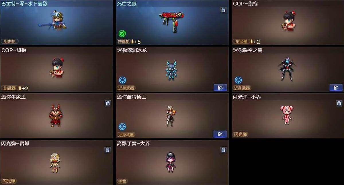 【人偶武器】:M4A1-雷神-精英刀锋,巴雷特-零-水下丽影,COP-旗袍*2,迷你深渊冰龙,迷你裂空之翼,迷你牛魔王,迷你波特博士,闪光弹-小乔,闪光弹-貂蝉,高爆手雷-大乔