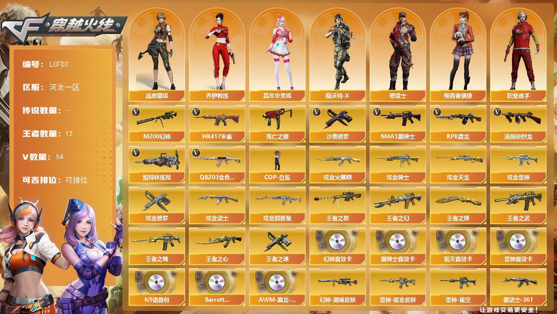 [17580402]幻神三件套,河北一区-59V-12王者武器数-7炫金武器数 【热门武器】:QBZ03-金色蔷薇*2,HK417-朱雀,M200-幻神,死亡之眼,M4A1-黑骑士*5,汤姆逊-烈龙*5,RPK-盘龙,加特林-炼狱,COP-白鲨,沙鹰-修罗*3 【王者炫金武器】:王者之幻,王者之武,王者之魄,王者之心,王者之怒,王者之魂,王者之锋,炫金火麒麟,炫金骑士,炫金雷神,炫金武士,炫金超新星,炫金天龙,炫金修罗 【音效卡】:M200-幻神音效卡,M4A1-雷神音效卡,M4A1-黑骑士音效卡,Barrett-毁灭音效卡,N9语音包,Barrett-碧霄极光音效卡,AWM-昌龙-怀旧音效卡 【皮肤】:幻神-周瑜皮肤,雷神-能量核心,雷神-星空,雷神-耀金皮肤,AK47-火麒麟-传奇EVEN,火麒麟-轻羽皮肤,火麒麟-心动糖果,毁灭-荣耀之怒,毁灭耀金皮肤,M4A1-千变-孔明皮肤,黑骑士-暗月,AK47-黑武士-361,战神-粉色甜心皮肤,战神-紫绶金章皮肤,战神-流金岁月皮肤,AK47-B-常胜将军-曹操,AK47-B-常胜将军-孙权,AWM-天龙-传奇70KG,修罗-能量核心 【角色】:樱,战地猎狐,王者春,乔伊教练,修道士,空,风暴女*2,嘉年华灵狐,零-水下丽影,潘多拉-X,潜龙队-X,斯沃特-X,蜀雪,铁骑荣耀,新娜塔莎,樱-青春偶像,影武者-X,职业选手 【人偶武器】:COP-白鲨,AWM-灵狐-15周年嘉年华,M37-葵,COP-旗袍,迷你深渊冰龙,迷你牛牛,深渊终结者手雷,闪光弹-小乔,闪光弹-貂蝉,高爆手雷-大乔,迷你艾比 【暴走生化】:死亡之眼,超级对讲机 【挑战大师】:致命乱世-超越Max,冰龙粉碎者-白马银枪,神圣爆裂者-末日III*2 【英雄级武器】:M4A1-千变*2,AK47-火麒麟*2,M4A1-黑龙,M4A1-雷神*3,M4A1-黑骑士*5,AK47-黑武士,AK12-天启*2,HK417-朱雀,M4A1-玫瑰精灵,QBZ03-金色蔷薇*2,王者之势-觉醒版,王者之戮-觉醒版,AK-47-猩红传说,AK47-B-战神,黑骑士-海王,AK47-B-常胜将军,机械迷城-穹宇,AK47-B-身先士卒,AK47-B-战士*2,AWM-天龙,Barrett-毁灭,M200-幻神,Barrett-朱雀,王者之决-觉醒版,RPK-盘龙,加特林-炼狱,汤姆逊-烈