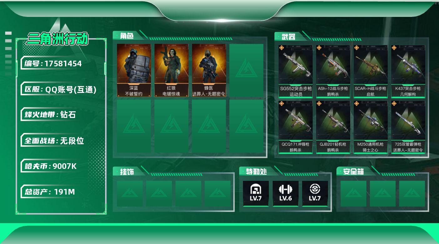 [17581454]【店主推荐捡漏号!可直接换绑】9007k哈伏币-168m流动资产-60烽火等级-钻石-1战场等级-无军衔 【干员外观】:蜂医-送葬人·无题密令,深蓝-不破誓约,红狼-电锯惊魂 【近战皮肤】:近战-黑鹰 【传说外观】:M4A1突击步枪-阿米娅,ASh-12战斗步枪-鹅鸭杀,SG552突击步枪-运动员,AK-12突击步枪-特斯拉线圈,SCAR-H战斗步枪-启航,腾龙突击步枪-捞点薯条,K437突击步枪-几何解构,Vector冲锋枪-能天使-午夜邮差,UZI冲锋枪-特斯拉线圈,SR-3M紧凑突击步枪-特斯拉线圈,勇士冲锋枪-能天使-午夜邮差,QCQ171冲锋枪-鹅鸭杀,725双管霰弹枪-送葬人-无题密令,M250通用机枪-骑士之心,QJB201轻机枪-鹅鸭杀,AWM狙击步枪-捞点薯条,93R-捞点薯条 【史诗外观】:ASh-12战斗步枪-碎冰行动,ASh-12战斗步枪-无极限,M16A4突击步枪-竞赛选手,AUG突击步枪-蝮蛇,SG552突击步枪-深海恐惧,SCAR-H战斗步枪-囚徒,G3战斗步枪-流沙送葬,AS Val突击步枪-百步穿杨,腾龙突击步枪-无垢,K437突击步枪-守护者,MP5冲锋枪-战术竞备,Vector冲锋枪-猎鳄行动,SR-3M紧凑突击步枪-荒野求生,SR-3M紧凑突击步枪-战术竞备,勇士冲锋枪-深海恐惧,勇士冲锋枪-工业狂潮,MP7冲锋枪-无垢,MP7冲锋枪-守护者,PKM通用机枪-蝮蛇,PKM通用机枪-荒野求生,M250通用机枪-囚徒,Mini-14射手步枪-守护者,SVD狙击步枪-荒野求生,PSG-1射手步枪-无垢,SV-98狙击步枪-林中猎手,SV-98狙击步枪-囚徒,SV-98狙击步枪-猎鳄行动,M700狙击步枪-哈夫克警备,AWM狙击步枪-无极限,沙漠之鹰-曙光,复合弓-守护者 【稀有外观】:Vector冲锋枪-花岗岩,R93狙击步枪-地平线,AKM突击步枪-战术演练,QBZ95-1突击步枪-公平竞技,ASh-12战斗步枪-繁盛,K416突击步枪-虎啸,M7战斗步枪-捣蛋鬼,SCAR-H战斗步枪-荣耀列队,SCAR-H战斗步枪-黄昏,G3战斗步枪-战术演练,G3战斗步枪-主宰,腾龙突击步枪-雪崩,腾龙突击步枪-冰天雪地,K437突击步枪-天狼星,K437突击步枪-精英联盟,MP5冲锋枪-弄臣,MP5冲锋枪-虎啸,MP5冲锋枪-哈夫克卫
