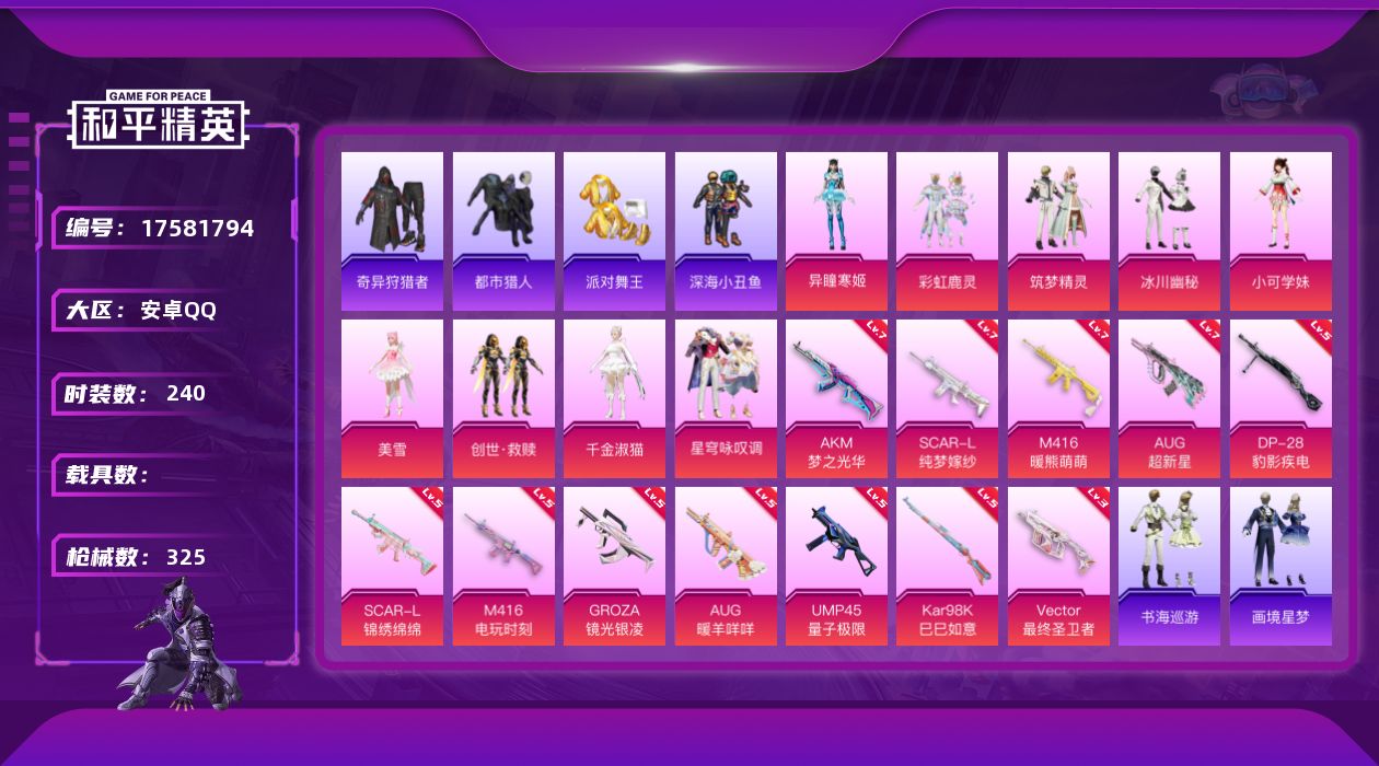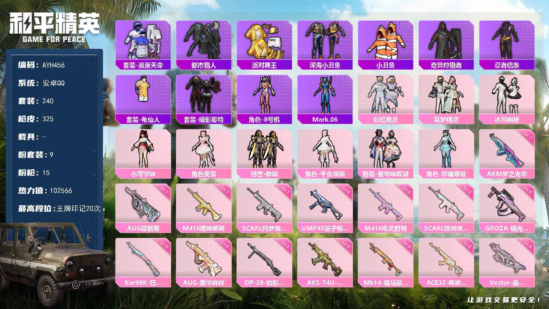 [17581794]极品素材号 安卓 手Q-9粉装-15特效枪-0载具-6粉色飞行器-102566热力值-20王牌印记-240套装-325枪皮【热门品类】:套装-浪漫天命,套装-都市猎人,套装-派对舞王,套装-深海小丑鱼,套装-小丑鱼,套装-奇异狩猎者,套装-忍者信条,套装-龟仙人,套装-暗影哥特,角色-8号机,角色-Mark.06【粉色套装】:粉装-彩虹鹿灵,粉装-筑梦精灵,粉装-冰川幽秘,角色-小可学妹,角色-美雪,套装-创世·救赎,角色-千金淑猫,粉装-星穹咏叹调,角色-异瞳寒姬【粉色枪皮等级】:AKM-梦之光华(七级),SCAR-L-纯梦嫁纱(七级),SCAR-L-锦绣绵绵(五级),M416-暖熊萌萌(七级),M416-电玩时刻(五级),GROZA-镜光银凌(五级),AUG-超新星(七级),AUG-暖羊咩咩(五级),ACE32-萌骑漫游(五级),UMP45-量子极限(五级),Vector-最终圣卫者(三级),AKS-74U-森灵之息(五级),Kar98K-巳巳如意(五级),Mk14-福马献瑞(五级),DP-28-豹影疾电(五级)【粉色枪皮】:AKM-梦之光华,SCAR-L-纯梦嫁纱,SCAR-L-锦绣绵绵,M416-暖熊萌萌,M416-电玩时刻,GROZA-镜光银凌,AUG-超新星,AUG-暖羊咩咩,ACE32-萌骑漫游,UMP45-量子极限,Vector-最终圣卫者,AKS-74U-森灵之息,Kar98K-巳巳如意,Mk14-福马献瑞,DP-28-豹影疾电【粉色飞行器】:炫彩糖果飞行器,镜域双华-灵镜之阶,绝色倾城飞行器,幻海精灵飞行器,曦光华影飞行器