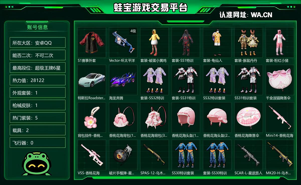 - [17287911]安卓 手Q-2粉装-6特效枪-0载具-1粉色飞行器-28369热力值-7王牌印记-77套装-97枪皮 【热门品类】:套装-暗影哥特 【粉色套装】:套装-创世·救赎,角色-异瞳寒姬 【粉色枪皮等级】:ACE32-萌骑漫游(四级),AKS-74U-森灵之息(五级),Kar98K-巳巳如意(五级),Mk14-福马献瑞(五级),AMR-智耀战神(七级),DP-28-豹影疾电(五级) 【粉色枪皮】:ACE32-萌骑漫游,AKS-74U-森灵之息,Kar98K-巳巳如意,Mk14-福马献瑞,AMR-智耀战神,DP-28-豹影疾电 【粉色飞行器】:炫彩糖果飞行器 【粉色降落伞】:绝对恒星降落伞,星之彼岸降落伞,异瞳寒姬降落伞,炫彩糖果降落伞 【稀有套装】:套装-雪国风尚,套装-炫彩糖果,套装-马上来财,角色-风玲,套装-极速光影,角色-紫俏灵猫,套装-书海巡游,套装-画境星梦,套装-琴音绮想,套装-雨过天青,套装-红釉青花 【稀有枪皮】:AUG-冰晶雪宝,AKM-破晓战魂,M16A4-幻世战舞者,SCAR-L-夜灯,SCAR-L-红色方程式,M416-红色方程式,GROZA-影袭,AUG-天降萌叽,AUG-耀粉歌者,AUG-绝对恒星,G36C-星穹咏叹调,AC-VAL-天降萌叽,ACE32-画境星梦,UZI-天降萌叽,UZI-红色方程式,UMP45-夜灯,MP5K-画境星梦,P90-巳巳如意,AWM-雷霆特警,Mini14-穿刺龙虾,M1加兰德-画境星梦,S686-生命誓言,S12K-玩趣呆呆,S12K-夜灯,S12K-极意拳锋,DBS-幻彩电音,AA12-G-画境星梦,M249-糯团青竹,MG3-幻世战舞者,爆炸猎弓-喜羊羊与灰太狼,平底锅-画境星梦 【其他套装】:套装-SS28特训,套装-SS29特训,套装-完美偶像,套装-幻世保卫者,套装-旭日情侣,套装-春日漫步,套装-暗影哥特,套装-森林游猎者,套装-海岛探路者,套装-深蓝色名流,套装-湖蓝色名流,套装-王牌教练,套装-生化防暴队,套装-白熊同盟,套装-白色伏地魔,套装-破蛋小黄鸡,套装-竞技名士,套装-竞技达人朋克,套装-红色运动,套装-缤纷果语,套装-蓝色运动,套装-都市魅力,套装-酒红色名流,套装-长空猛禽,套装-青涩时光,套装-青玉碎影,套装-魅力单车,套装-鹤鸣,套装-黄色运动,套装-黑色伏地魔,套装-鹰眼刺