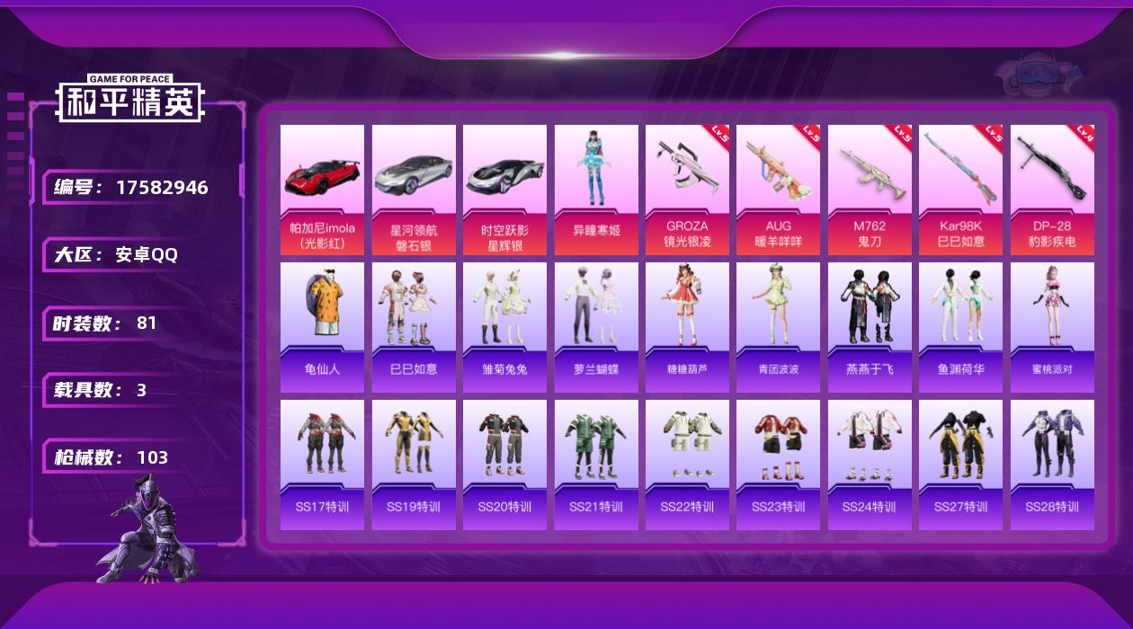 [17582946]【1222】安卓 手Q-1粉装-5特效枪-3载具-0粉色飞行器-32569热力值-4王牌印记-81套装-103枪皮 【热门品类】:套装-龟仙人 【粉色载具】:帕加尼imola(光影红),星河领航(磐石银),时空跃影(星辉银) 【粉色套装】:角色-异瞳寒姬 【粉色枪皮等级】:GROZA-镜光银凌(五级),AUG-暖羊咩咩(五级),M762-鬼刀(五级),Kar98K-巳巳如意(五级),DP-28-豹影疾电(四级) 【粉色枪皮】:GROZA-镜光银凌,AUG-暖羊咩咩,M762-鬼刀,Kar98K-巳巳如意,DP-28-豹影疾电 【粉色降落伞】:炫光之旅降落伞 【稀有套装】:套装-龟仙人,套装-巳巳如意,套装-雏菊兔兔,套装-萝兰蝴蝶,套装-糖糖葫芦,套装-青团波波,套装-燕燕于飞,套装-鱼渊荷华,角色-蜜桃派对 【稀有枪皮】:AKM-冰凉西瓜,AKM-彩虹符号,AKM-破晓战魂,M16A4-幻世战舞者,SCAR-L-玉兔迎春,M416-糯团青竹,M416-红色方程式,GROZA-黑色刀锋,AUG-天降萌叽,AUG-耀粉歌者,M762-天降萌叽,M762-彩虹符号,AC-VAL-天降萌叽,蜜獾-天降萌叽,蜜獾-娇憨猪猪,UZI-天降萌叽,UZI-娇憨猪猪,UZI-红色方程式,UMP45-夜灯,UMP45-涂山之恋,UMP45-绒宝小鹅,汤姆逊-耀粉歌者,AKS-74U-鬼刀,P90-巳巳如意,Kar98K-炫彩节奏,M24-炫彩节奏,SKS-炫彩节奏,VSS-彩虹符号,SLR-娇憨猪猪,S686-彩虹符号,S686-生命誓言,S686-红色方程式,S686-巳巳如意,S1897-炫彩节奏,S12K-娇憨猪猪,S12K-幻世战舞者,DBS-彩虹符号,M249-糯团青竹,DP-28-彩虹符号,MG3-妙红点点,MG3-幻世战舞者,短管霰弹-星穹咏叹调,蝎式手枪-千金淑猫,大砍刀-鬼刀,破片手榴弹-巳巳如意 【其他套装】:套装-SS17特训,套装-SS19特训,套装-SS20特训,套装-SS21特训,套装-SS22特训,套装-SS23特训,套装-SS24特训,套装-SS27特训,套装-SS28特训,套装-SS29特训,套装-光之冒险,套装-冷焰舞者,套装-完美偶像,套装-幻世战舞者,套装-柠萌假日,套装-森林游猎者,套装-海岛探路者,套装-涂山之恋,套装-湖蓝色名流,套装-