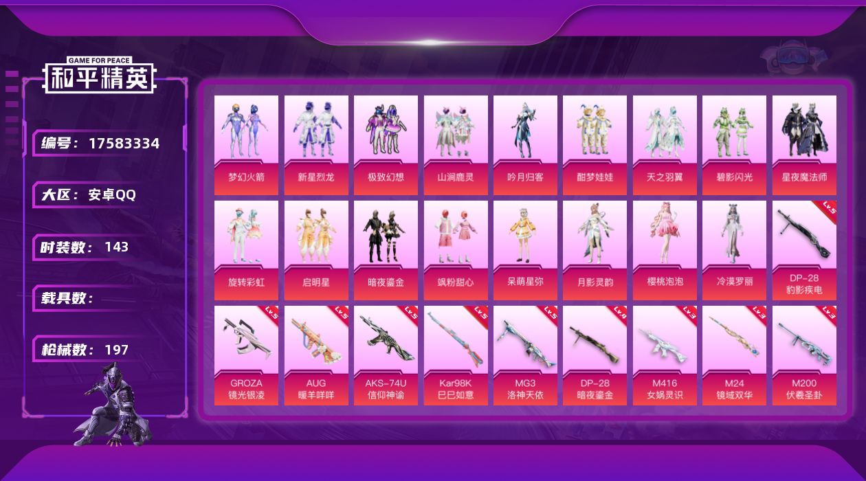 [17583334]【1235】安卓 手Q-17粉装-11特效枪-0载具-4粉色飞行器-68758热力值-5王牌印记-143套装-197枪皮 【热门品类】:粉装-梦幻火箭,套装-龟仙人 【粉色套装】:粉装-梦幻火箭,粉装-新星烈龙,粉装-极致幻想,粉装-山涧鹿灵,粉装-吟月归客,粉装-酣梦娃娃,粉装-天之羽翼,粉装-碧影闪光,粉装-星夜魔法师,粉装-旋转彩虹,粉装-启明星,粉装-暗夜鎏金,粉装-飒粉甜心,角色-呆萌星弥,角色-月影灵韵,角色-樱桃泡泡,角色-冷漠罗丽 【粉色枪皮等级】:M416-女娲灵识(三级),GROZA-镜光银凌(五级),AUG-暖羊咩咩(五级),AKS-74U-信仰神谕(五级),Kar98K-巳巳如意(五级),M24-镜域双华(三级),M200-伏羲圣卦(三级),DP-28-暗夜鎏金(四级),DP-28-豹影疾电(五级),MG3-洛神天依(五级),MG-36-幻彩电音(三级) 【粉色枪皮】:M416-女娲灵识,GROZA-镜光银凌,AUG-暖羊咩咩,AKS-74U-信仰神谕,Kar98K-巳巳如意,M24-镜域双华,M200-伏羲圣卦,DP-28-暗夜鎏金,DP-28-豹影疾电,MG3-洛神天依,MG-36-幻彩电音 【粉色飞行器】:春暖花开飞行器,星夜魔法师飞行翼,歌者泠鸢飞行器,镜域双华-灵镜之阶 【粉色降落伞】:甜心宝贝降落伞,春暖花开降落伞,洛神天依降落伞,蓝莓炮弹降落伞,甜心娃娃降落伞,暗星紫秘降落伞,天之羽翼降落伞,碧影闪光降落伞,筑梦精灵降落伞,星夜魔法师降落伞,歌者泠鸢降落伞,暗夜鎏金降落伞,第五大道降落伞,镜域双华降落伞,拳皇·狂花道降落伞,月影灵韵降落伞,赛博古神降落伞,樱桃泡泡降落伞,星穹咏叹调降落伞,幻彩电音降落伞,荧海星豚降落伞 【稀有套装】:套装-龟仙人,套装-巳巳如意,套装-小鸟芋圆,套装-雏菊兔兔,套装-萝兰蝴蝶,角色-狂花道·雅典娜,套装-糖糖葫芦,套装-青团波波,角色-许七安,角色-光矢逐梦,套装-燕燕于飞,套装-鱼渊荷华,套装-粉恋花,套装-紫幽梦,套装-蓝冰羽,套装-星影赞美诗,套装-霓虹热舞,套装-极速光影,套装-彩虹兔,套装-云朵鹅,套装-雪绒豹,角色-灵公主 【稀有枪皮】:AKM-墨染幽兰,AKM-彩虹符号,AKM-影袭,AKM-春暖花开,AKM-破晓战魂,AKM-筑梦精灵,M16A4-幻世战舞者,M16A4-甜心亚