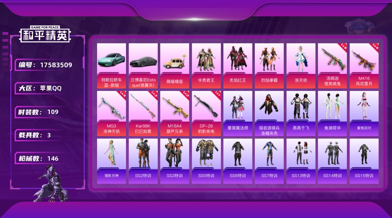 [17583509]【1445】苹果 手Q-4粉装-6特效枪-3载具-2粉色飞行器-48062热力值-2王牌印记-109套装-146枪皮 【热门品类】:小恶魔头饰,熔岩游骑兵面罩,熔岩游骑兵连帽夹克 【粉色载具】:特斯拉Roadster(水滴蓝),兰博基尼Estoque(银翼灰),萌喵橘座 【粉色套装】:粉装-华贵君王,粉装-炙焰红王,粉装-烈焰拳霸,角色-洛天依 【粉色枪皮等级】:M16A4-葫芦兄弟(二级),M416-风花雪月(四级),汤姆逊-怪笑疯兔(六级),Kar98K-巳巳如意(三级),DP-28-豹影疾电(一级),MG3-洛神天依(四级) 【粉色枪皮】:M16A4-葫芦兄弟,M416-风花雪月,汤姆逊-怪笑疯兔,Kar98K-巳巳如意,DP-28-豹影疾电,MG3-洛神天依 【粉色飞行器】:绮梦青鸾飞行器,齐天大圣飞行器 【粉色降落伞】:百万伏特降落伞,至尊龙雀降落伞,精灵迷巫降落伞,梦幻火箭降落伞,激战未来降落伞,银刃赛罗降落伞,怪笑疯兔降落伞,葫芦兄弟降落伞,暗夜玫瑰降落伞,洛神天依降落伞,樱桃泡泡降落伞 【稀有套装】:套装-燕燕于飞,套装-鱼渊荷华,角色-蜜桃派对,角色-猎影月神 【稀有枪皮】:AKM-冰凉西瓜,AKM-四圣焕新,AKM-夜灯,AKM-生命誓言,AKM-破晓战魂,AKM-萌趣颜团子,AKM-虎虎生威,AKM-霓虹街区,M16A4-夜灯,M16A4-幻世战舞者,M16A4-生命誓言,M16A4-蓝色火焰,M16A4-魔法学院,SCAR-L-炫彩节奏,SCAR-L-生命誓言,SCAR-L-黄金龙骨,M416-绯红前夜,M416-蓝色火焰,M416-魔法学院,GROZA-彩虹符号,GROZA-治愈之星,GROZA-生命誓言,GROZA-银河战甲,GROZA-黑色刀锋,AUG-耀粉歌者,AUG-青春冒险家,AUG-魅夜紫皇,AUG-魔法学院,QBZ-洛神天依,QBZ-赛罗,M762-天降萌叽,M762-拳皇97,M762-瑞龙福将,M762-绯红前夜,Mk47-洛神天依,Mk47-百万伏特,Mk47-青春冒险家,G36C-时空追击者,G36C-暗夜玫瑰,G36C-绮梦青鸾,Famas-月下星之子,UZI-天降萌叽,UZI-炫彩节奏,UZI-生命誓言,UMP45-夜灯,UMP45-快乐主宰,UMP45-时空追击者,UMP45-春暖花开,Vector-夜灯,Ve