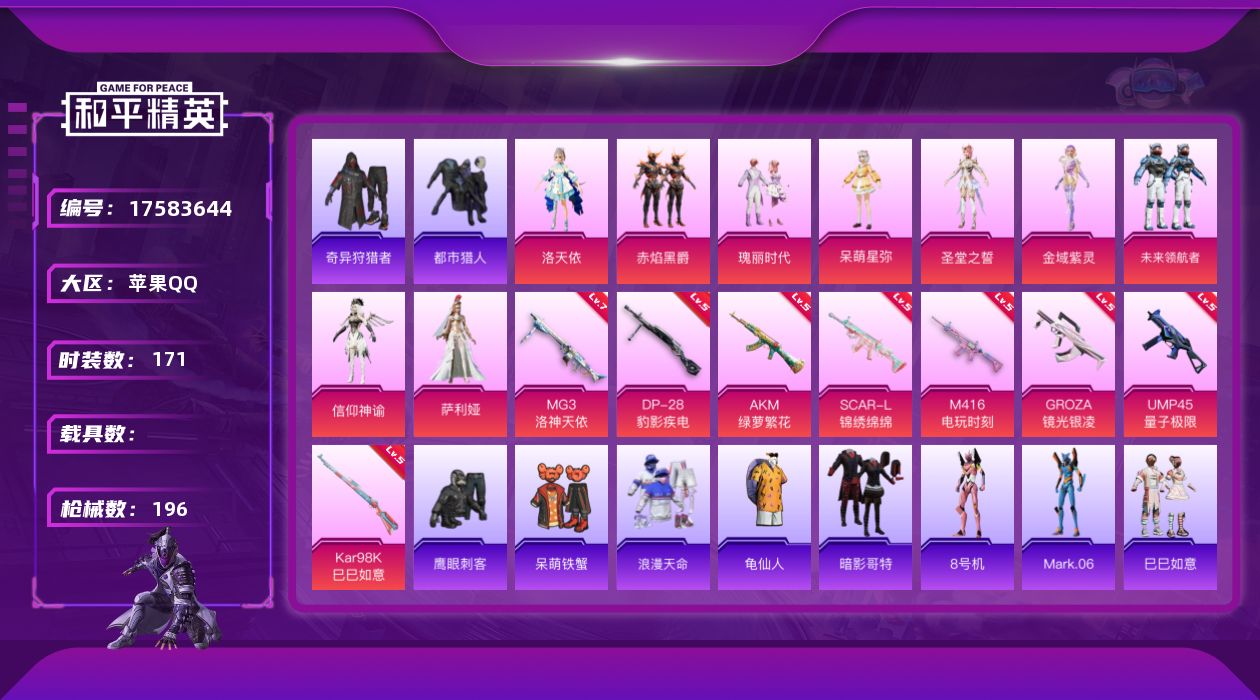 [17583644]【1451】苹果 手Q-9粉装-8特效枪-0载具-4粉色飞行器-63652热力值-13王牌印记-171套装-196枪皮 【热门品类】:套装-浪漫天命,套装-都市猎人,套装-奇异狩猎者,套装-龟仙人,套装-暗影哥特,角色-8号机,角色-Mark.06 【粉色套装】:角色-洛天依,粉装-赤焰黑爵,粉装-瑰丽时代,角色-呆萌星弥,角色-圣堂之誓,角色-金域紫灵,粉装-未来领航者,角色-信仰神谕,角色-萨利娅 【粉色枪皮等级】:AKM-绿萝繁花(五级),SCAR-L-锦绣绵绵(五级),M416-电玩时刻(五级),GROZA-镜光银凌(五级),UMP45-量子极限(五级),Kar98K-巳巳如意(五级),DP-28-豹影疾电(五级),MG3-洛神天依(七级) 【粉色枪皮】:AKM-绿萝繁花,SCAR-L-锦绣绵绵,M416-电玩时刻,GROZA-镜光银凌,UMP45-量子极限,Kar98K-巳巳如意,DP-28-豹影疾电,MG3-洛神天依 【粉色飞行器】:梦幻火箭飞行器,星夜魔法师飞行翼,信仰神谕飞行器,万象金身飞行器 【粉色降落伞】:洛神天依降落伞,暗星紫秘降落伞,冷魅冰骑降落伞,星夜魔法师降落伞,垂柳戏鸭降落伞,彩虹甜喵降落伞,第五大道降落伞,白勺歌姬降落伞,未来歌姬降落伞,炫光之旅降落伞,镜光幻境降落伞,守护天翼降落伞,初号机 觉醒Ver.降落伞,拳皇·狂花道降落伞,未来领航者降落伞,临安公主降落伞,信仰神谕降落伞,月影灵韵降落伞,幻影飞狐降落伞 【稀有套装】:套装-龟仙人,套装-巳巳如意,套装-雏菊兔兔,套装-萝兰蝴蝶,套装-小熊娃娃,套装-糖糖葫芦,套装-青团波波,套装-棉花软糖,角色-摩登魅猫,套装-净心行者,角色-许七安,套装-黑曜寓言,角色-光矢逐梦,套装-燕燕于飞,套装-鱼渊荷华,角色-糖霜甜心 【稀有枪皮】:AKM-彩虹符号,AKM-影袭,AKM-灼热熔岩,AKM-生命誓言,AKM-破晓战魂,AKM-虎虎生威,AKM-霓虹街区,AKM-龙的传人,M16A4-幻世战舞者,M16A4-红色方程式,M16A4-蓝色火焰,SCAR-L-夜灯,SCAR-L-玉兔迎春,SCAR-L-红色方程式,SCAR-L-净心行者,M416-糯团青竹,M416-红色方程式,M416-绯红前夜,M416-蓝色火焰,GROZA-影袭,GROZA-恐龙拽拽,GROZA-懵萌河马,GRO