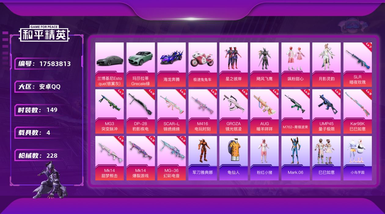 [17583813]【1472】安卓 手Q-4粉装-13特效枪-4载具-1粉色飞行器-74679热力值-11王牌印记-149套装-228枪皮 【热门品类】:角色-军刀雅典娜,套装-龟仙人,套装-粉红小猪,角色-Mark.06 【粉色载具】:兰博基尼Estoque(银翼灰),玛莎拉蒂Grecale(薄荷绿),海龙奔腾,极速兔兔车,空客H135-蔚蓝之翼 【粉色套装】:粉装-星之彼岸,粉装-飓风飞鹰,粉装-飒粉甜心,角色-月影灵韵 【粉色枪皮等级】:SCAR-L-锦绣绵绵(五级),M416-电玩时刻(五级),GROZA-镜光银凌(五级),AUG-暖羊咩咩(五级),M762-青锋波束(五级),UMP45-量子极限(五级),Kar98K-巳巳如意(五级),Mk14-甜梦熊击(五级),Mk14-爆裂游戏(五级),SLR-暗夜玫瑰(七级),DP-28-豹影疾电(五级),MG3-突变脉冲(七级),MG-36-幻彩电音(三级) 【粉色枪皮】:SCAR-L-锦绣绵绵,M416-电玩时刻,GROZA-镜光银凌,AUG-暖羊咩咩,M762-青锋波束,UMP45-量子极限,Kar98K-巳巳如意,Mk14-甜梦熊击,Mk14-爆裂游戏,SLR-暗夜玫瑰,DP-28-豹影疾电,MG3-突变脉冲,MG-36-幻彩电音 【粉色飞行器】:凤舞九天飞行器 【粉色降落伞】:深海曼妙降落伞,梦幻火箭降落伞,炫紫旋律降落伞,洛神天依降落伞,圣光天使降落伞,环太平洋降落伞,垂柳戏鸭降落伞,彩虹甜喵降落伞,旋转彩虹降落伞,青空秋雨降落伞,第五大道降落伞,飒粉甜心降落伞,蜜语绒猫降落伞,精灵梦叶罗丽降落伞,盛世惊鸿降落伞,鬼刀降落伞,雪月幻音降落伞,幻星舰长降落伞,冷漠罗丽降落伞 【稀有套装】:套装-龟仙人,套装-巳巳如意,套装-小鸟芋圆,套装-雏菊兔兔,套装-萝兰蝴蝶,套装-糖糖葫芦,套装-青团波波,角色-摩登魅猫,套装-燕燕于飞,套装-鱼渊荷华,套装-旋风灵鼠,套装-焰舞炽心,套装-粉恋花,套装-紫幽梦,套装-蓝冰羽,角色-鲛海歌灵,套装-星渊小夜曲,套装-虚空漩涡,套装-引力深渊,套装-云朵鹅,套装-雪绒豹,套装-诡诞巡游,套装-混沌火种 【稀有枪皮】:AKM-彩虹符号,AKM-江南烟雨,AKM-环太平洋,AKM-生命誓言,AKM-破晓战魂,AKM-虎虎生威,M16A4-快乐主宰,M16A4-甜心亚梦,SCAR-L-夜灯,