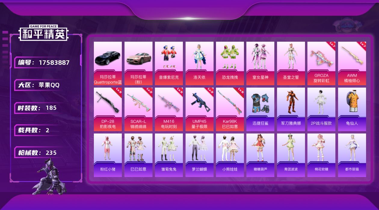 [17583887]【1473】苹果 手Q-5粉装-7特效枪-2载具-0粉色飞行器-82705热力值-9王牌印记-185套装-235枪皮