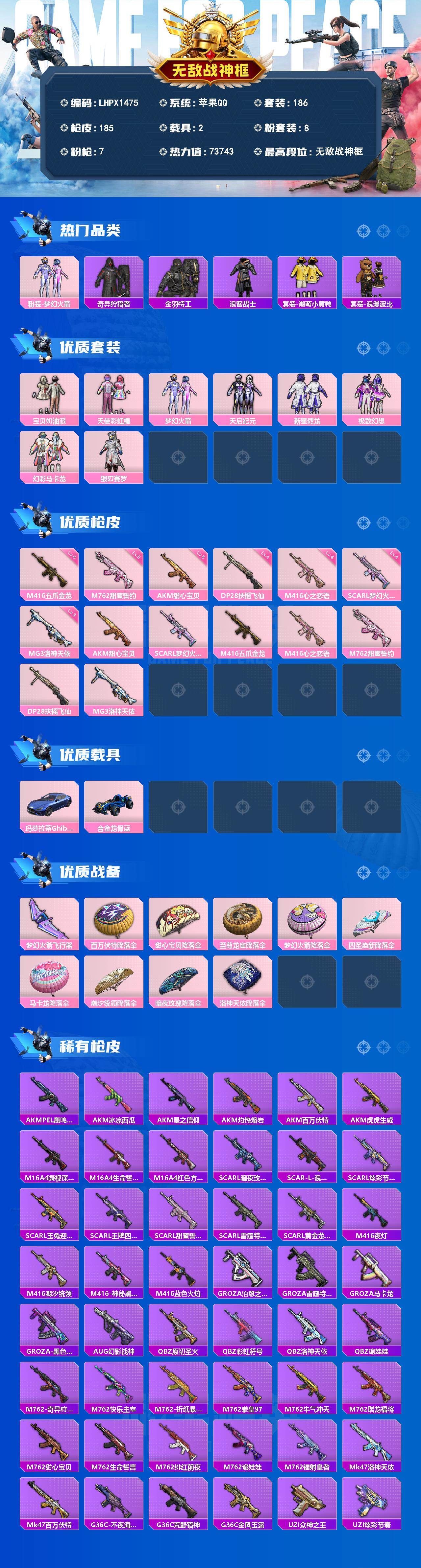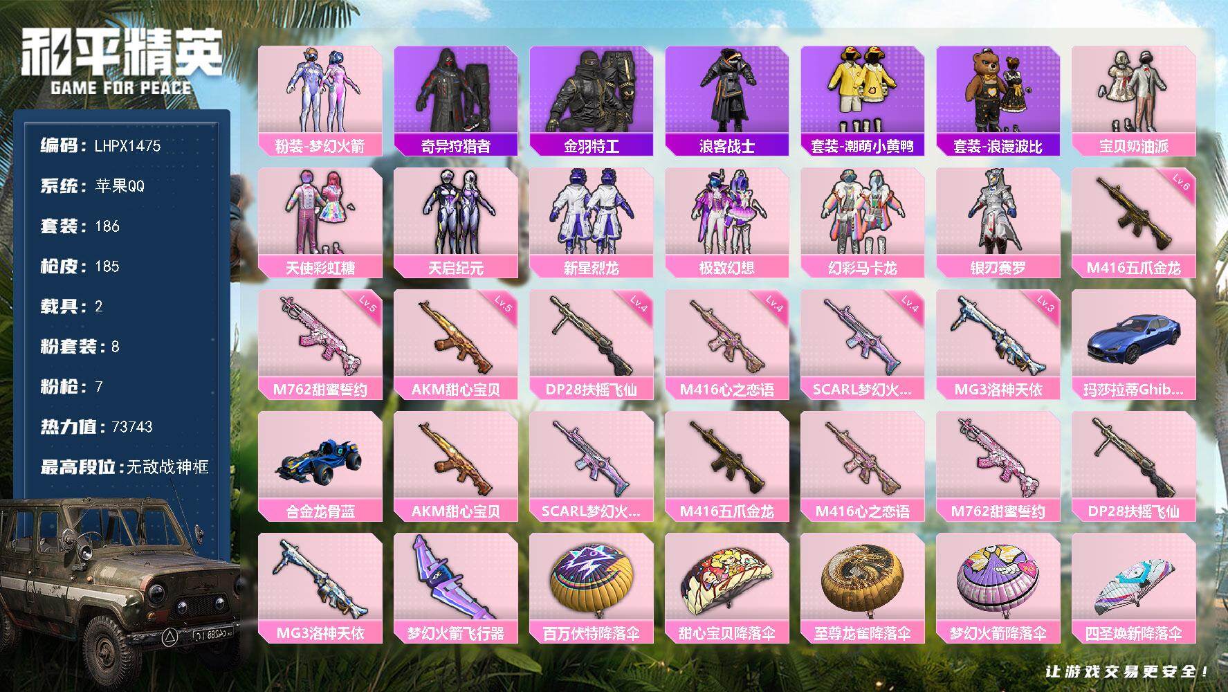 [17588670]4个战神框/ 苹果 手Q-无敌战神框-8粉装-7特效枪-2载具-1粉色飞行器-73743热力值-14王牌印记-186套装-185枪皮 【热门品类】:粉装-梦幻火箭,套装-奇异狩猎者,套装-金羽特工,套装-浪客战士,套装-潮萌小黄鸭,套装-浪漫波比 【粉色套装】:粉装-宝贝奶油派,粉装-天使彩虹糖,粉装-梦幻火箭,粉装-天启纪元,粉装-新星烈龙,粉装-极致幻想,粉装-幻彩马卡龙,粉装-银刃赛罗 【粉色枪皮等级】:AKM-甜心宝贝(五级),SCAR-L-梦幻火箭(四级),M416-五爪金龙(六级),M416-心之恋语(四级),M762-甜蜜誓约(五级),DP-28-扶摇飞仙(四级),MG3-洛神天依(三级) 【粉色载具】:玛莎拉蒂Ghibli(蓝),合金龙骨(蓝) 【粉色枪皮】:AKM-甜心宝贝,SCAR-L-梦幻火箭,M416-五爪金龙,M416-心之恋语,M762-甜蜜誓约,DP-28-扶摇飞仙,MG3-洛神天依 【粉色飞行器】:梦幻火箭飞行器 【粉色降落伞】:百万伏特降落伞,甜心宝贝降落伞,至尊龙雀降落伞,梦幻火箭降落伞,四圣焕新降落伞,马卡龙降落伞,潮汐统领降落伞,暗夜玫瑰降落伞,洛神天依降落伞 【稀有枪皮】:AKM-PEL轰鸣竞梦者,AKM-冰凉西瓜,AKM-星之信仰,AKM-灼热熔岩,AKM-百万伏特,AKM-虎虎生威,M16A4-凝视深渊,M16A4-生命誓言,M16A4-红色方程式,SCAR-L-暗夜玫瑰,SCAR-L-浪客战士,SCAR-L-炫彩节奏,SCAR-L-玉兔迎春,SCAR-L-王牌四分卫,SCAR-L-甜蜜誓约,SCAR-L-雷霆特警,SCAR-L-黄金龙骨,M416-夜灯,M416-潮汐统领,M416-神秘黑猫,M416-蓝色火焰,GROZA-治愈之星,GROZA-雷霆特警,GROZA-马卡龙,GROZA-黑色刀锋,AUG-幻影战神,QBZ-原初圣火,QBZ-彩虹符号,QBZ-洛神天依,QBZ-诡娃娃,M762-奇异狩猎者,M762-快乐主宰,M762-折纸暴龙,M762-拳皇97,M762-牛气冲天,M762-瑞龙福将,M762-甜心宝贝,M762-生命誓言,M762-绯红前夜,M762-诡娃娃,M762-镭射皇者,Mk47-洛神天依,Mk47-百万伏特,G36C-不夜海上花,G36C-荒野猎神,G36C-金风玉露,UZI-众神之王,