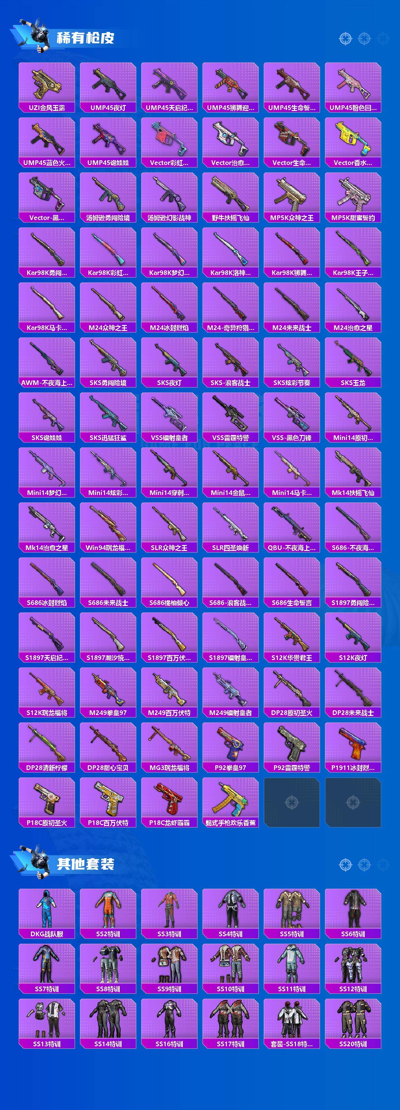 【稀有枪皮】:AKM-PEL轰鸣竞梦者,AKM-冰凉西瓜,AKM-星之信仰,AKM-灼热熔岩,AKM-百万伏特,AKM-虎虎生威,M16A4-凝视深渊,M16A4-生命誓言,M16A4-红色方程式,SCAR-L-暗夜玫瑰,SCAR-L-浪客战士,SCAR-L-炫彩节奏,SCAR-L-玉兔迎春,SCAR-L-王牌四分卫,SCAR-L-甜蜜誓约,SCAR-L-雷霆特警,SCAR-L-黄金龙骨,M416-夜灯,M416-潮汐统领,M416-神秘黑猫,M416-蓝色火焰,GROZA-治愈之星,GROZA-雷霆特警,GROZA-马卡龙,GROZA-黑色刀锋,AUG-幻影战神,QBZ-原初圣火,QBZ-彩虹符号,QBZ-洛神天依,QBZ-诡娃娃,M762-奇异狩猎者,M762-快乐主宰,M762-折纸暴龙,M762-拳皇97,M762-牛气冲天,M762-瑞龙福将,M762-甜心宝贝,M762-生命誓言,M762-绯红前夜,M762-诡娃娃,M762-镭射皇者,Mk47-洛神天依,Mk47-百万伏特,G36C-不夜海上花,G36C-荒野猎神,G36C-金风玉露,UZI-众神之王,