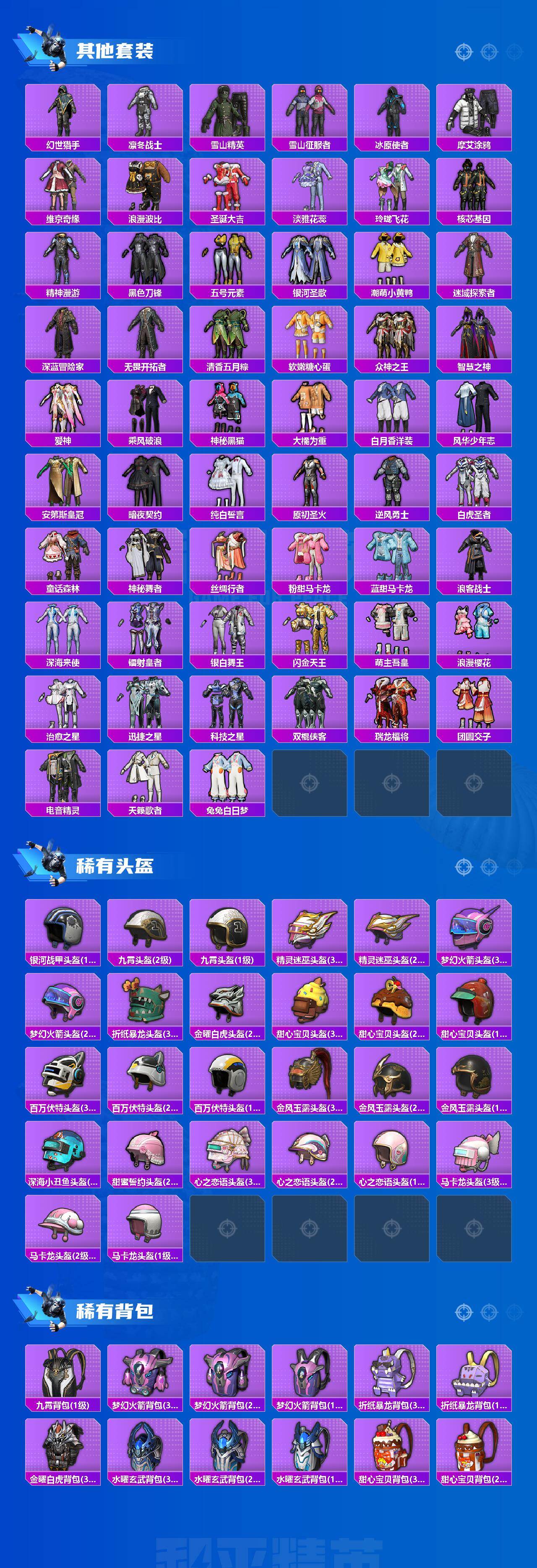 - [17885206]安卓 手Q-无敌战神框-22粉装-10特效枪-3载具-2粉色飞行器-95997热力值-19王牌印记-202套装-278枪皮 【热门品类】:粉装-梦幻火箭,粉装-童趣迷兔,绝对防御上衣,套装-浪漫天命,套装-都市猎人,套装-奇异狩猎者,角色-军刀雅典娜,套装-龟仙人,套装-暗影哥特,套装-浪漫波比 【粉色套装】:粉装-宝贝奶油派,粉装-天使彩虹糖,粉装-梦幻火箭,粉装-天禅智恒,粉装-冰霜白皇,粉装-童趣迷兔,粉装-炙焰红王,粉装-香水柠檬,粉装-虎啸骄阳,粉装-炙焰赤龙,粉装-骨龙祭渊,粉装-暗夜玫瑰,粉装-精灵娃娃,粉装-恐龙拽拽,粉装-绚丽摇曳,粉装-闪耀律动,粉装-橘柚倾心,粉装-赤焰黑爵,粉装-紫电风暴,角色-复仇流浪者,粉装-暖熊萌萌,角色-圣堂之誓 【粉色枪皮等级】:SCAR-L-梦幻火箭(一级),SCAR-L-童趣迷兔(五级),SCAR-L-机甲封神(二级),M416-五爪金龙(六级),AUG-星之彼岸(四级),M762-冷魅冰骑(六级),ACE32-萌骑漫游(四级),UMP45-恐龙拽拽(六级),Kar98K-巳巳如意(五级),Mk14-福马献瑞(五级) 【粉色载具】:特斯拉Roadster(沁心粉),焰龙咆哮,俏皮小熊猫 【粉色枪皮】:SCAR-L-梦幻火箭,SCAR-L-童趣迷兔,SCAR-L-机甲封神,M416-五爪金龙,AUG-星之彼岸,M762-冷魅冰骑,ACE32-萌骑漫游,UMP45-恐龙拽拽,Kar98K-巳巳如意,Mk14-福马献瑞 【粉色飞行器】:梦幻火箭飞行器,暗翼战神飞行器 【粉色降落伞】:极限特训降落伞,至尊龙雀降落伞,梦幻火箭降落伞,神秘黑猫降落伞,古堡领主降落伞,四圣焕新降落伞,夏日绵绵冰降落伞,童趣迷兔降落伞,星之彼岸降落伞,古战神甲降落伞,林间仙鹿降落伞,洛神天依降落伞,海渊国主降落伞,焦糖拿铁降落伞,恐龙拽拽降落伞,橘柚倾心降落伞,冷魅冰骑降落伞,垂柳戏鸭降落伞,圣堂之誓降落伞,创世·救赎降落伞 【稀有套装】:套装-龟仙人,套装-巳巳如意,套装-马上来财,套装-画境星梦,套装-琴音绮想,套装-雨过天青,套装-红釉青花 【稀有枪皮】:AKM-四圣焕新,AKM-夜灯,AKM-彩虹符号,AKM-影袭,AKM-恐龙拽拽,AKM-海渊国主,AKM-灼热熔岩,AKM-玉龙,AKM-生命誓言,AKM-百万伏特,AKM-萌趣颜团