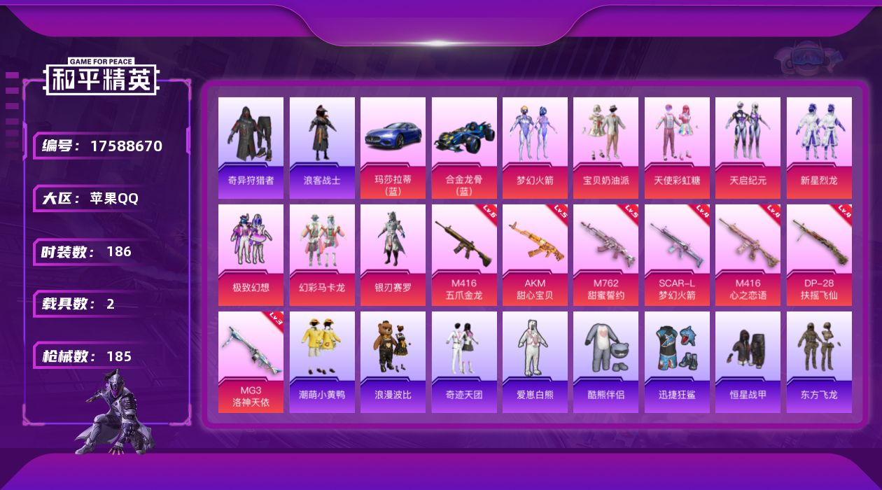 [17588670]4个战神框/ 苹果 手Q-无敌战神框-8粉装-7特效枪-2载具-1粉色飞行器-73743热力值-14王牌印记-186套装-185枪皮