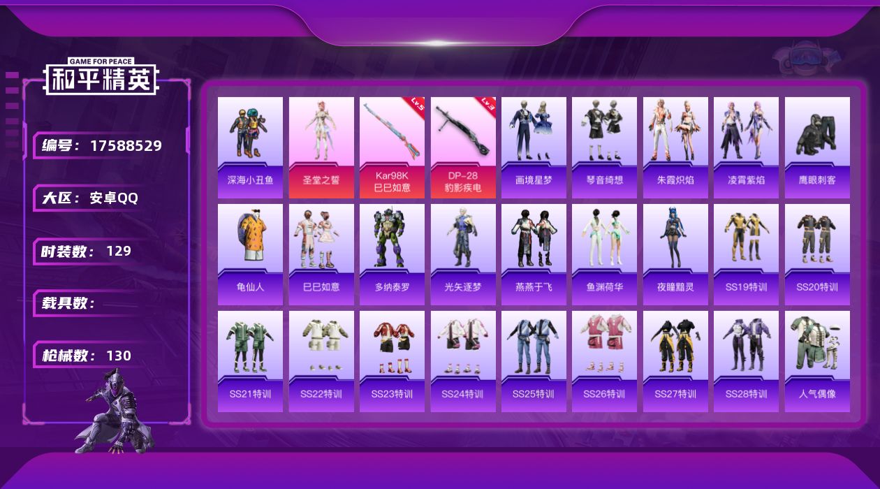 [17588529]可二次【特价出售/店主推荐】安卓 手Q-1粉装-2特效枪-34630热力值-3王牌印记-129套装-130枪皮【热门品类】:套装-深海小丑鱼,套装-龟仙人【粉色套装】:角色-圣堂之誓【粉色枪皮等级】:Kar98K-巳巳如意(五级),DP-28-豹影疾电(三级)