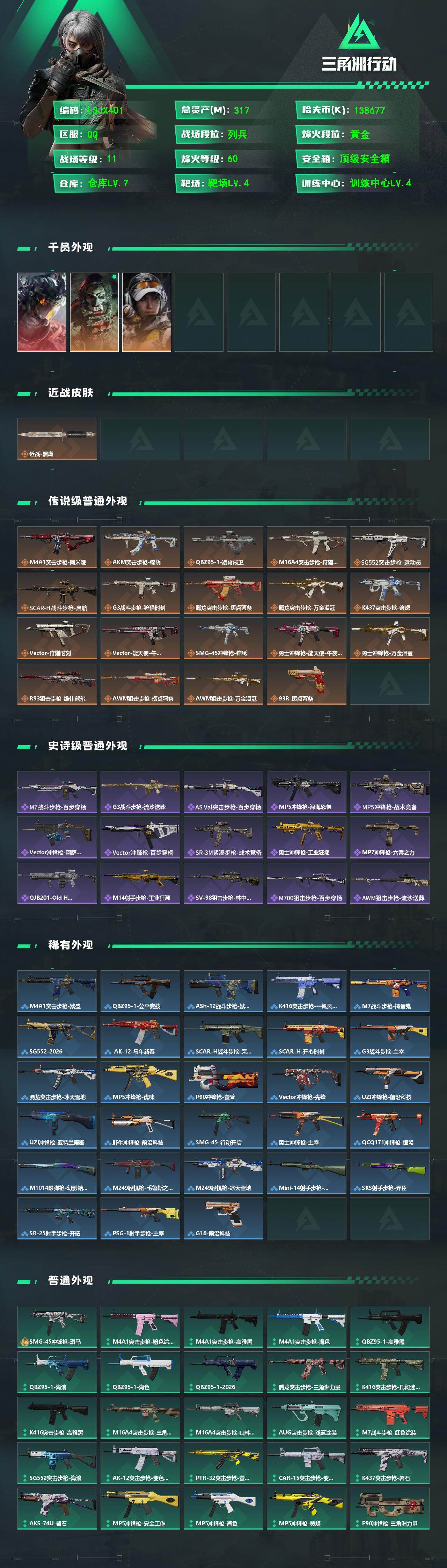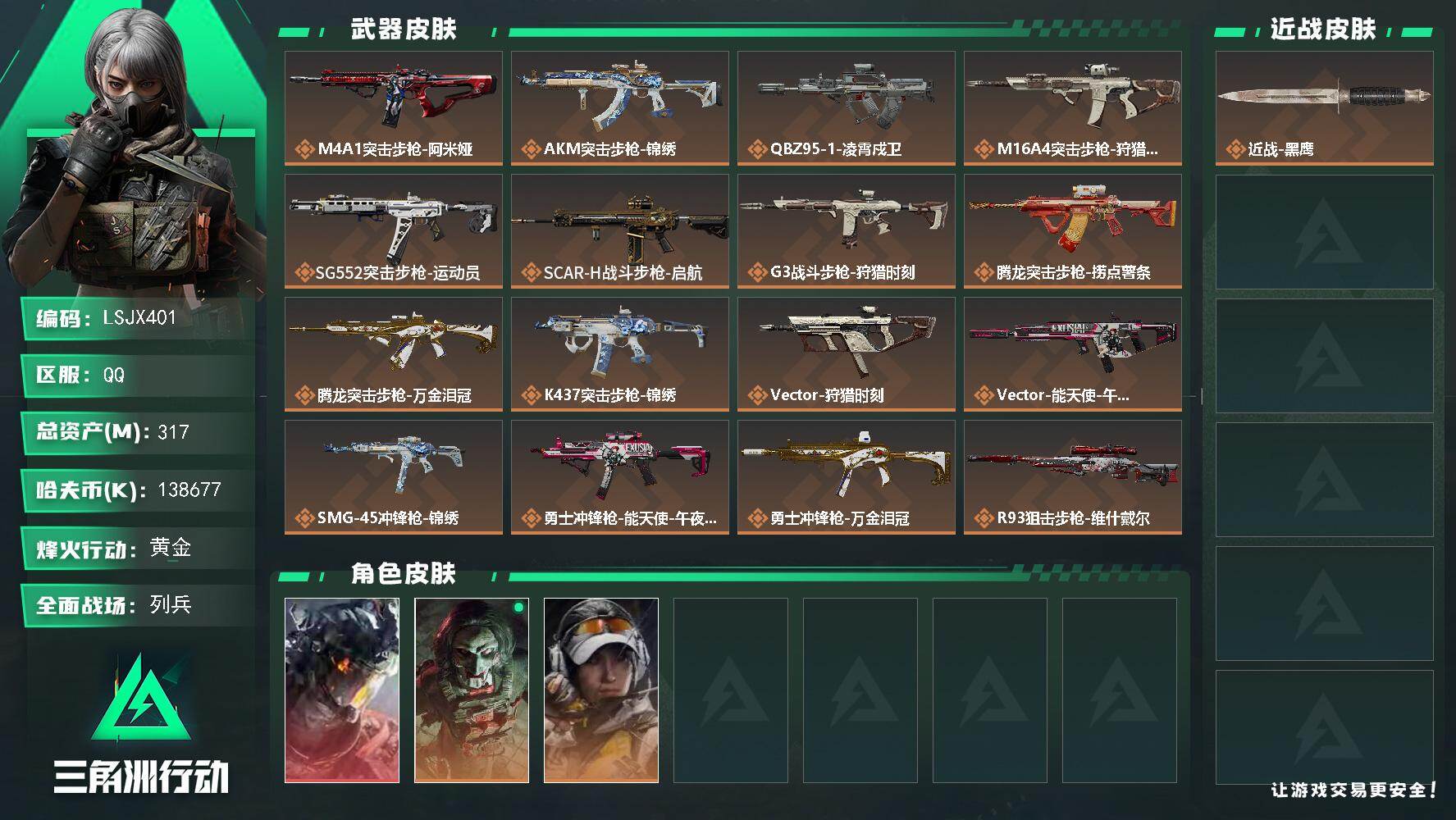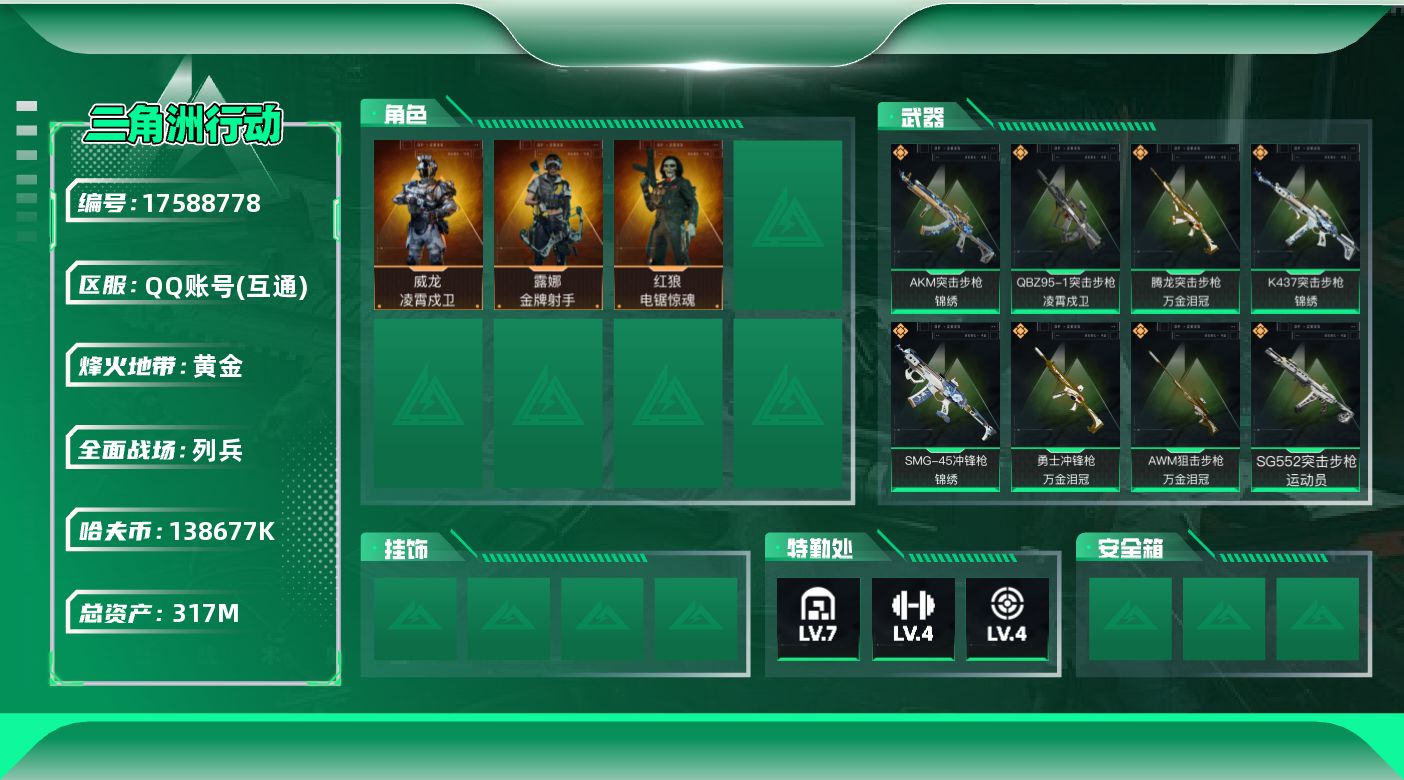 [17588778]【特价出售/店主推荐】317m总资产-138677k哈伏币-60烽火等级-黄金-11战场等级-列兵 【干员外观】:威龙-凌霄戍卫,红狼-电锯惊魂,露娜-金牌射手 【近战皮肤】:近战-黑鹰 【传说外观】:M4A1突击步枪-阿米娅,AKM突击步枪-锦绣,QBZ95-1突击步枪-凌霄戍卫,M16A4突击步枪-狩猎时刻,SG552突击步枪-运动员,SCAR-H战斗步枪-启航,G3战斗步枪-狩猎时刻,腾龙突击步枪-捞点薯条,腾龙突击步枪-万金泪冠,K437突击步枪-锦绣,Vector冲锋枪-狩猎时刻,Vector冲锋枪-能天使-午夜邮差,SMG-45冲锋枪-锦绣,勇士冲锋枪-能天使-午夜邮差,勇士冲锋枪-万金泪冠,R93狙击步枪-维什戴尔,AWM狙击步枪-捞点薯条,AWM狙击步枪-万金泪冠,93R-捞点薯条 【史诗外观】:M7战斗步枪-百步穿杨,G3战斗步枪-流沙送葬,AS Val突击步枪-百步穿杨,MP5冲锋枪-深海恐惧,MP5冲锋枪-战术竞备,Vector冲锋枪-阿萨拉文明,Vector冲锋枪-百步穿杨,SR-3M紧凑突击步枪-战术竞备,勇士冲锋枪-工业狂潮,MP7冲锋枪-六套之力,QJB201轻机枪-Old Habits,M14射手步枪-工业狂潮,SV-98狙击步枪-林中猎手,M700狙击步枪-百步穿杨,AWM狙击步枪-流沙送葬 【稀有外观】:M4A1突击步枪-繁盛,QBZ95-1突击步枪-公平竞技,ASh-12战斗步枪-繁盛,K416突击步枪-一帆风顺,M7战斗步枪-捣蛋鬼,SG552突击步枪-2026, AK-12突击步枪-马年新春,SCAR-H战斗步枪-荣耀列队,SCAR-H战斗步枪-开心时刻,G3战斗步枪-主宰,腾龙突击步枪-冰天雪地,MP5冲锋枪-虎啸,P90冲锋枪-黄昏,Vector冲锋枪-先锋,UZI冲锋枪-前沿科技,UZI冲锋枪-亚特兰蒂斯,野牛冲锋枪-前沿科技,SMG-45冲锋枪-行动开启,勇士冲锋枪-主宰,QCQ171冲锋枪-银鹭,M1014霰弹枪-幻影结构,M249轻机枪-毛鲁斯之力,M249轻机枪-冰天雪地,Mini-14射手步枪-荣耀列队,SKS射手步枪-弄臣,SR-25射手步枪-开拓,PSG-1射手步枪-主宰,G18-前沿科技 【普通外观】:SMG-45冲锋枪-斑马,M4A1突击步枪-粉色涂装,M4A1突击步枪-高雅黑,M4A1突击步枪-海