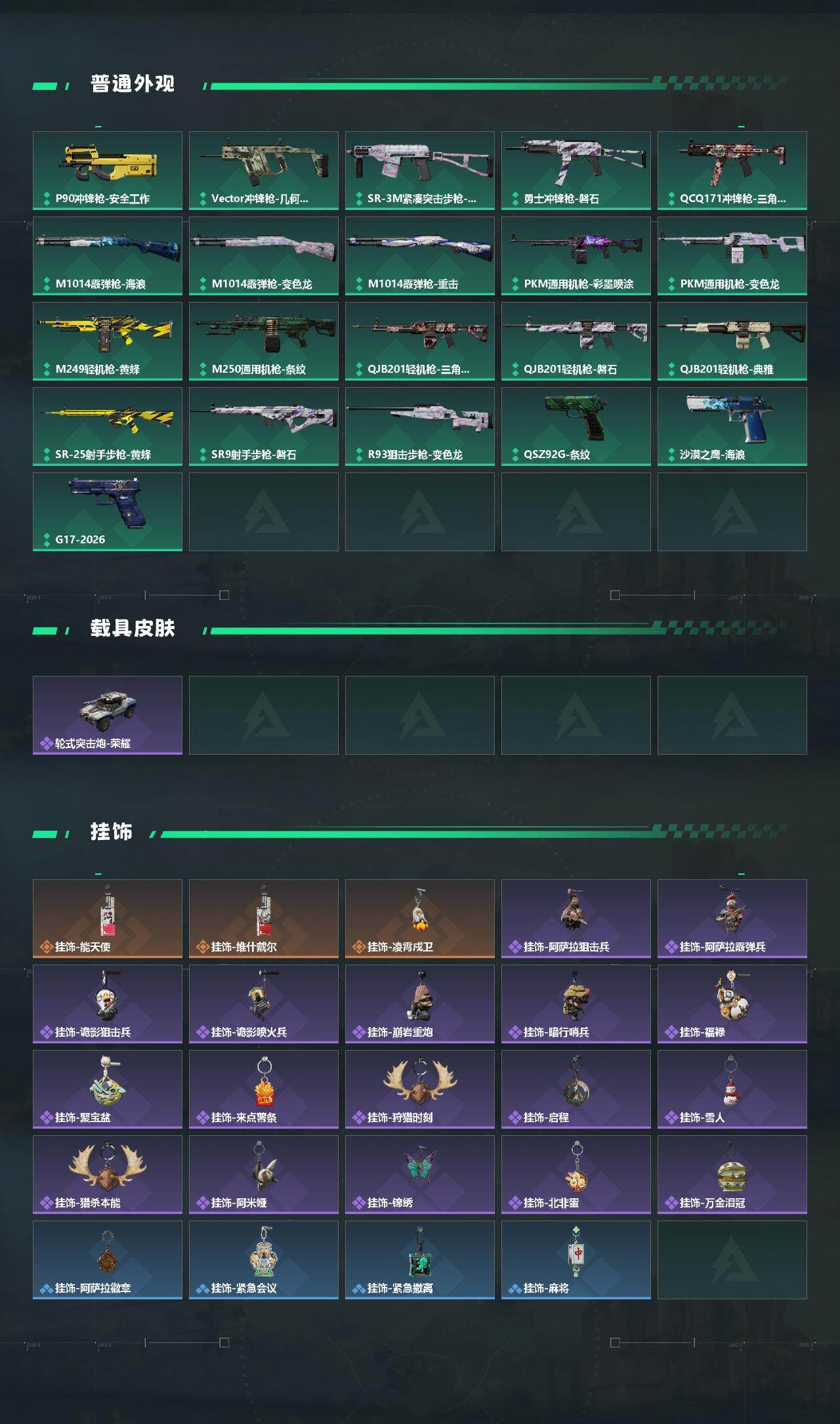 【史诗外观】:M7战斗步枪-百步穿杨,G3战斗步枪-流沙送葬,AS Val突击步枪-百步穿杨,MP5冲锋枪-深海恐惧,MP5冲锋枪-战术竞备,Vector冲锋枪-阿萨拉文明,Vector冲锋枪-百步穿杨,SR-3M紧凑突击步枪-战术竞备,勇士冲锋枪-工业狂潮,MP7冲锋枪-六套之力,QJB201轻机枪-Old Habits,M14射手步枪-工业狂潮,SV-98狙击步枪-林中猎手,M700狙击步枪-百步穿杨,AWM狙击步枪-流沙送葬