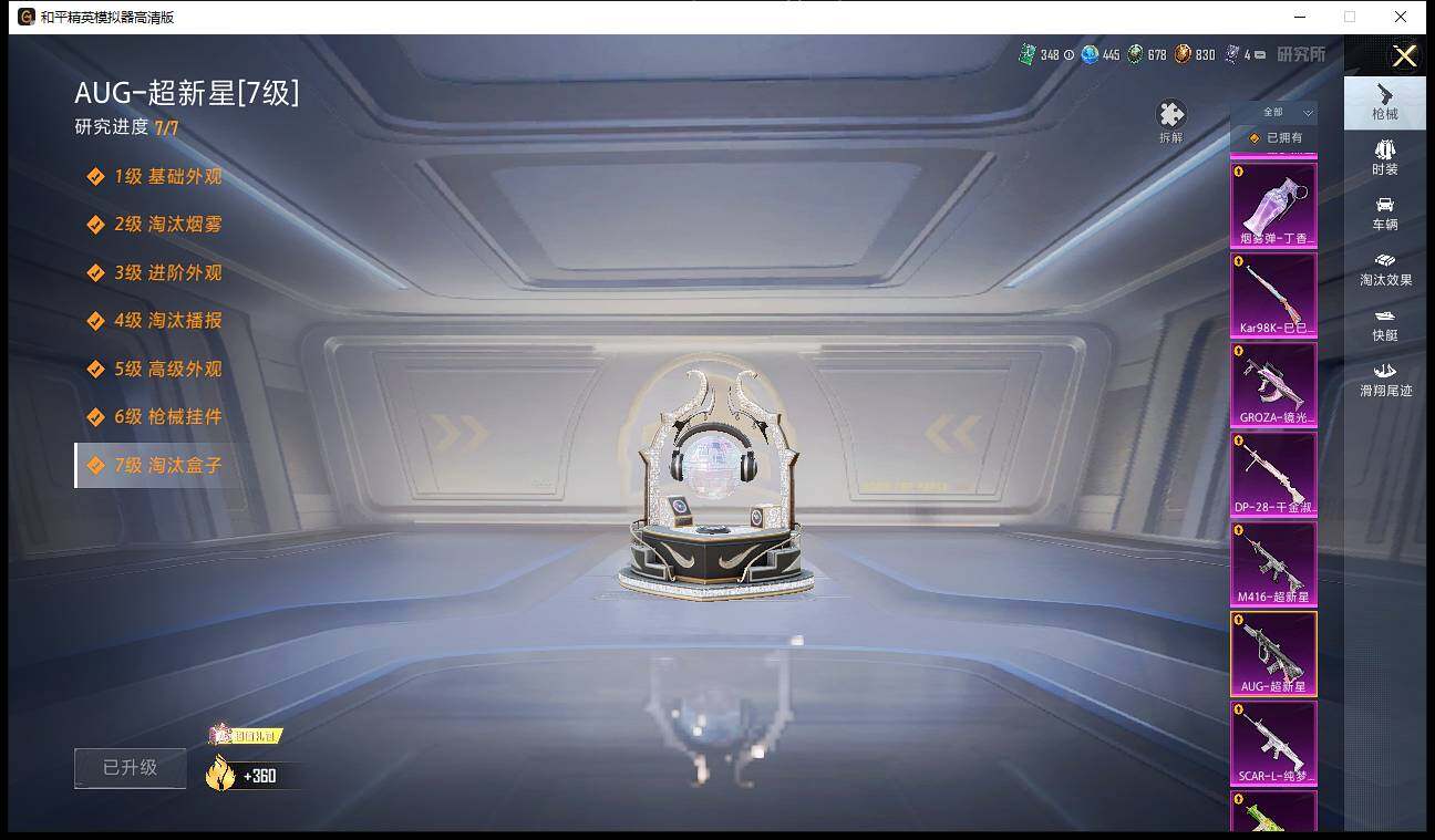 AKM-炫紫旋律,SCAR-L-纯梦嫁纱,M416-风花雪月,M416-超新星,GROZA-焦糖拿铁,GROZA-镜光银凌,AUG-超新星,UMP45-恐龙拽拽,Kar98K-巳巳如意,SKS-碧影闪光,DP-28-千金淑猫,MG3-洛神天依,烟雾弹-丁香清露