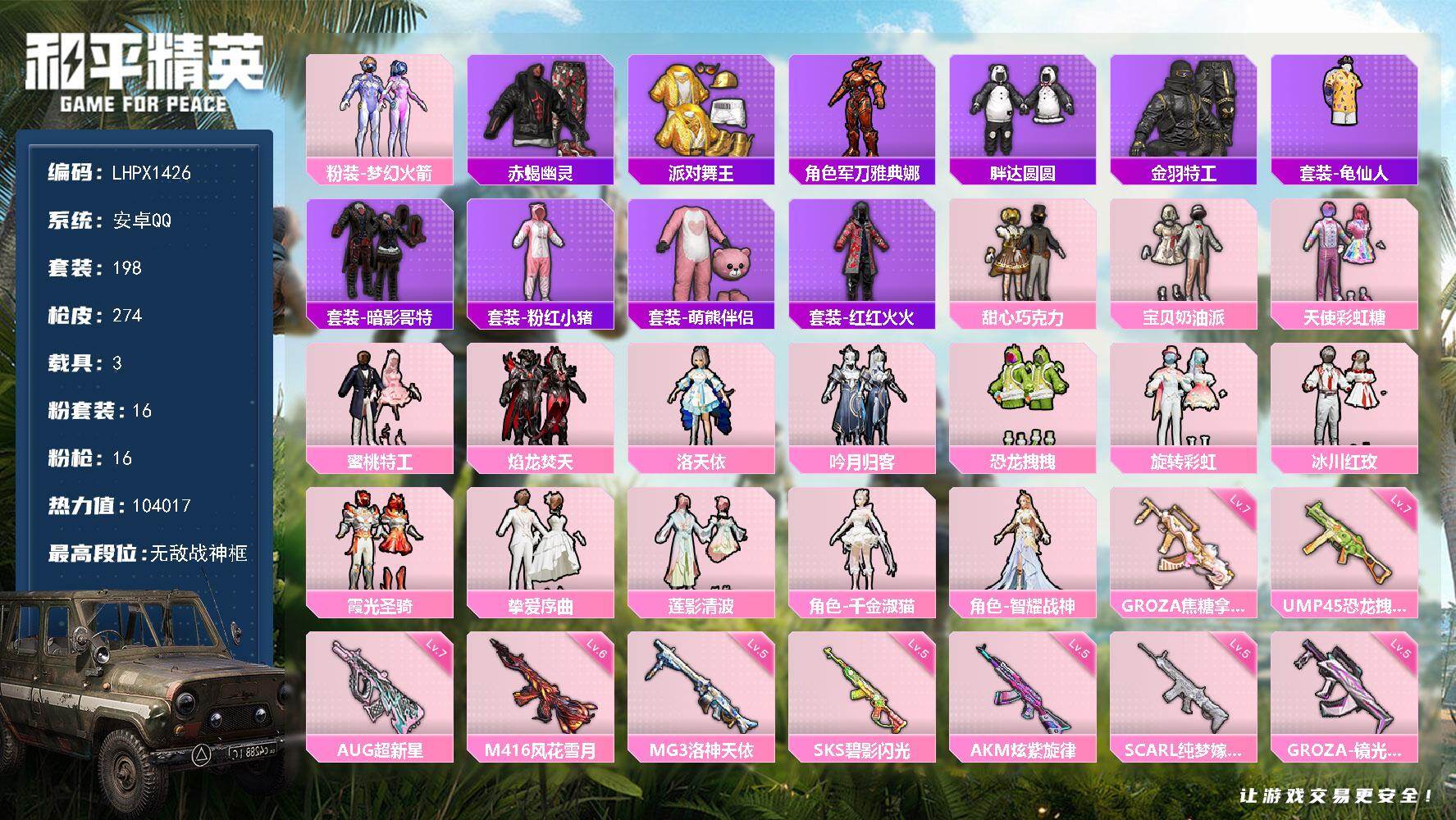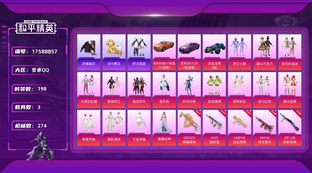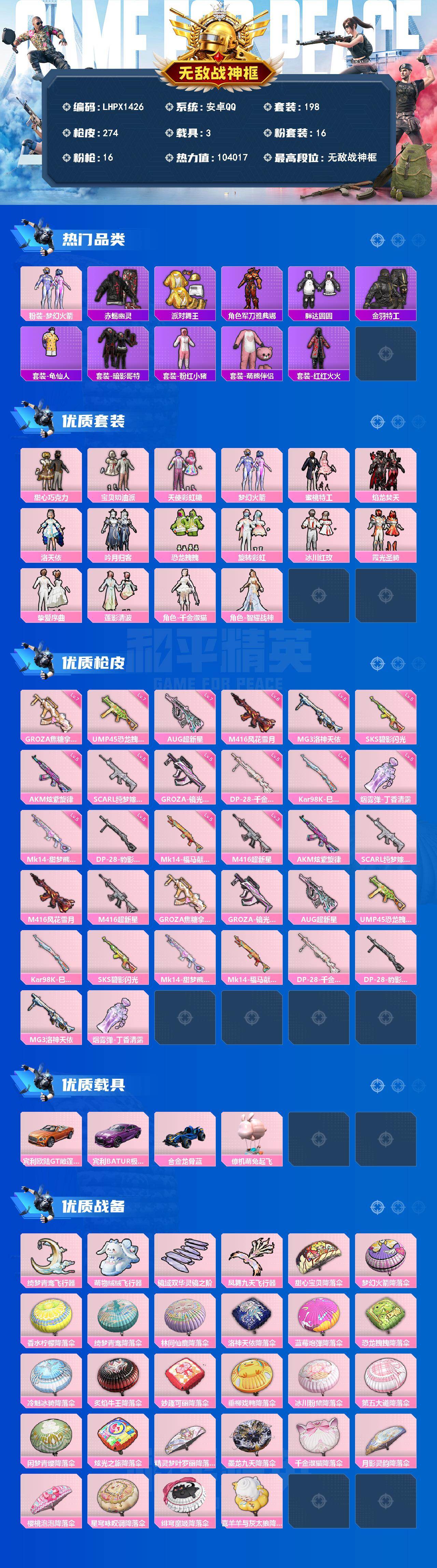 - [16871110]安卓 手Q-2粉装-4特效枪-0载具-1粉色飞行器-42704热力值-5王牌印记-124套装-166枪皮 【热门品类】:套装-浪漫天命,套装-龟仙人 【粉色套装】:粉装-未来歌姬,粉装-蜜语绒猫 【粉色枪皮等级】:UMP45-恐龙拽拽(七级),Kar98K-巳巳如意(五级),DP-28-豹影疾电(五级) 【粉色枪皮】:UMP45-恐龙拽拽,Kar98K-巳巳如意,Mk14-福马献瑞,DP-28-豹影疾电 【粉色飞行器】:炫彩糖果飞行器 【粉色降落伞】:神秘黑猫降落伞,垂柳戏鸭降落伞,第五大道降落伞,蜜语绒猫降落伞,江南烟雨降落伞,智耀战神降落伞,异瞳寒姬降落伞,炫彩糖果降落伞 【稀有套装】:套装-龟仙人,套装-巳巳如意,套装-雪国风尚,套装-炫彩糖果,角色-俏兔智灵,套装-燕燕于飞,套装-鱼渊荷华,玩偶服-小狗蛇点点,角色-瑰梦爱神,角色-绛羽幽主,套装-画境星梦,套装-琴音绮想,套装-红釉青花 【稀有枪皮】:AUG-冰晶雪宝,AKM-彩虹符号,AKM-影袭,AKM-恐龙拽拽,AKM-破晓战魂,AKM-龙的传人,M16A4-幻世战舞者,M16A4-红色方程式,M16A4-蓝色火焰,SCAR-L-夜灯,SCAR-L-炫彩节奏,SCAR-L-玉兔迎春,SCAR-L-红色方程式,SCAR-L-小狗蛇点点,M416-糯团青竹,M416-红色方程式,M416-蓝色火焰,GROZA-懵萌河马,GROZA-林间仙鹿,GROZA-田园牧歌,AUG-2P战斗服款,AUG-耀粉歌者,AUG-闲梦青缨,M762-天降萌叽,M762-彩虹符号,Mk47-妙红点点,G36C-懵萌河马,AC-VAL-天降萌叽,AC-VAL-闲梦青缨,蜜獾-天降萌叽,蜜獾-娇憨猪猪,ACE32-画境星梦,UZI-天降萌叽,UZI-娇憨猪猪,UZI-影袭,UZI-炫彩节奏,UZI-红色方程式,UMP45-涂山之恋,UMP45-生命誓言,UMP45-蓝色火焰,Vector-生命誓言,Vector-田园牧歌,汤姆逊-天降萌叽,汤姆逊-幻影战神,汤姆逊-林间仙鹿,汤姆逊-炫彩节奏,汤姆逊-耀粉歌者,野牛-天星战神,MP5K-画境星梦,P90-巳巳如意,Kar98K-红色方程式,M24-炫彩节奏,SKS-炫彩节奏,SKS-糯团青竹,VSS-彩虹符号,VSS-田园牧歌,Mini14-旋转彩虹,Mini14-涂山之恋,Mi