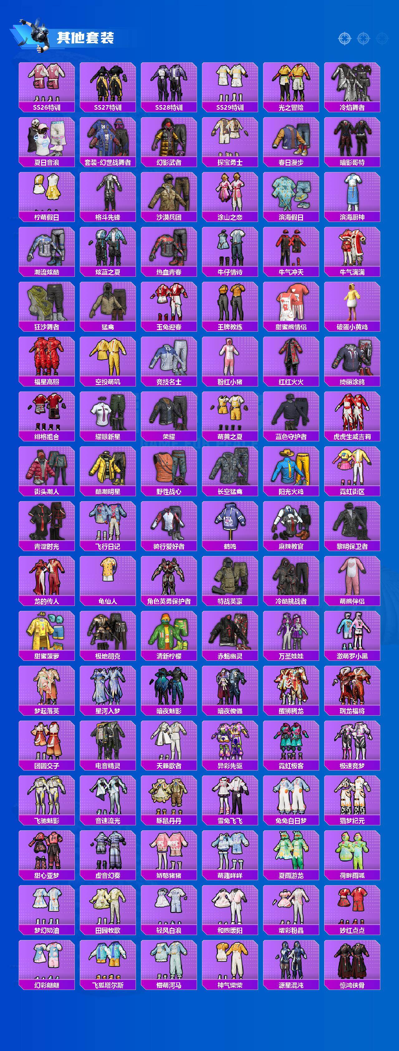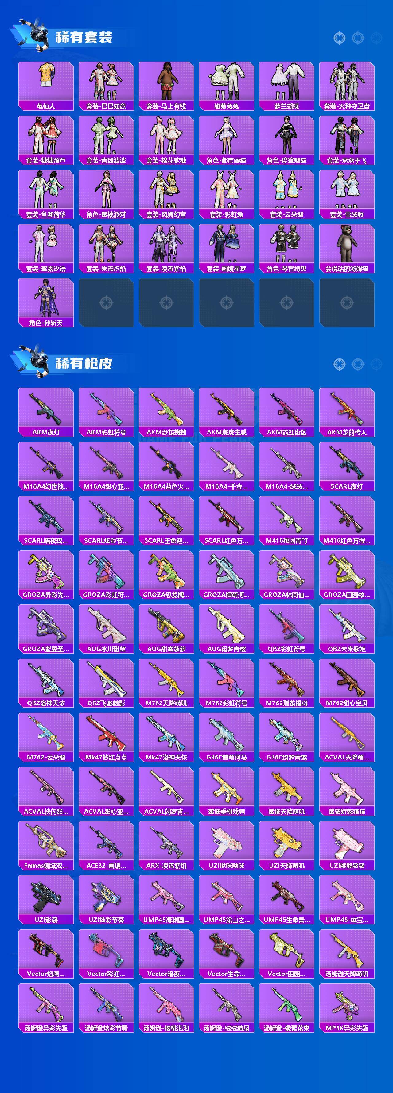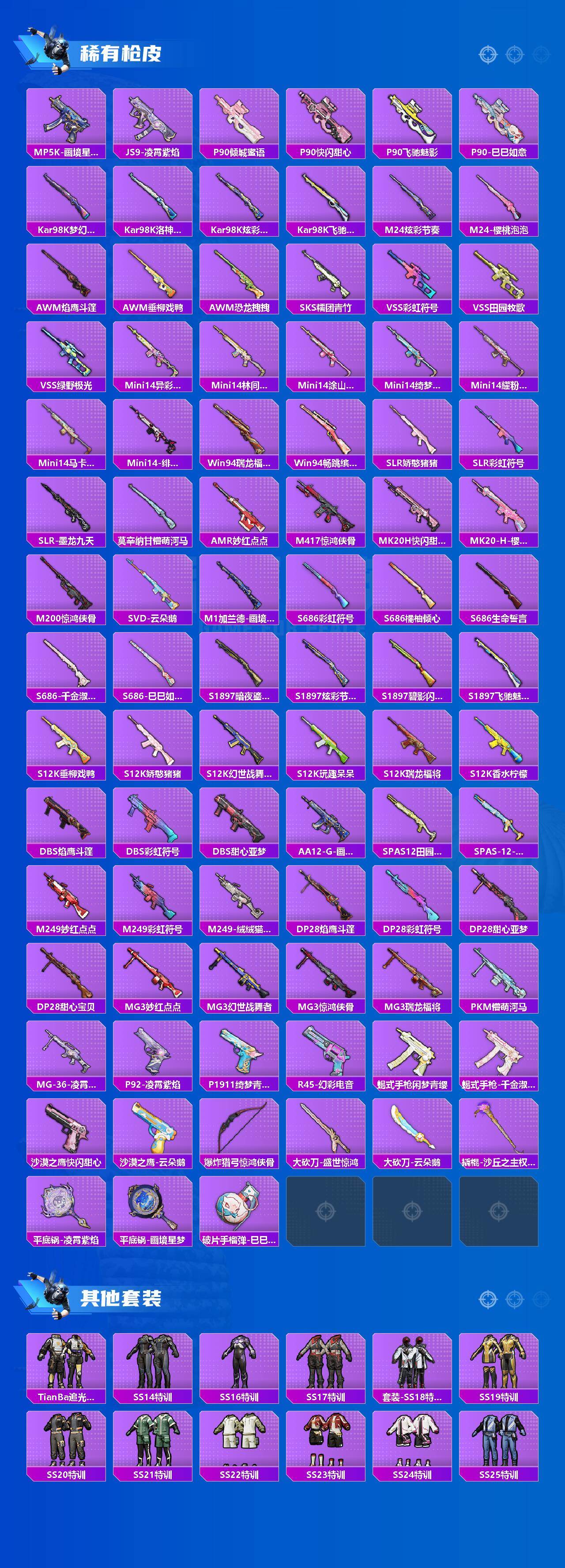 【粉色枪皮】:AKM-炫紫旋律,SCAR-L-纯梦嫁纱,M416-风花雪月,M416-超新星,GROZA-焦糖拿铁,GROZA-镜光银凌,AUG-超新星,UMP45-恐龙拽拽,Kar98K-巳巳如意,SKS-碧影闪光,Mk14-甜梦熊击,Mk14-福马献瑞,DP-28-千金淑猫,DP-28-豹影疾电,MG3-洛神天依,烟雾弹-丁香清露