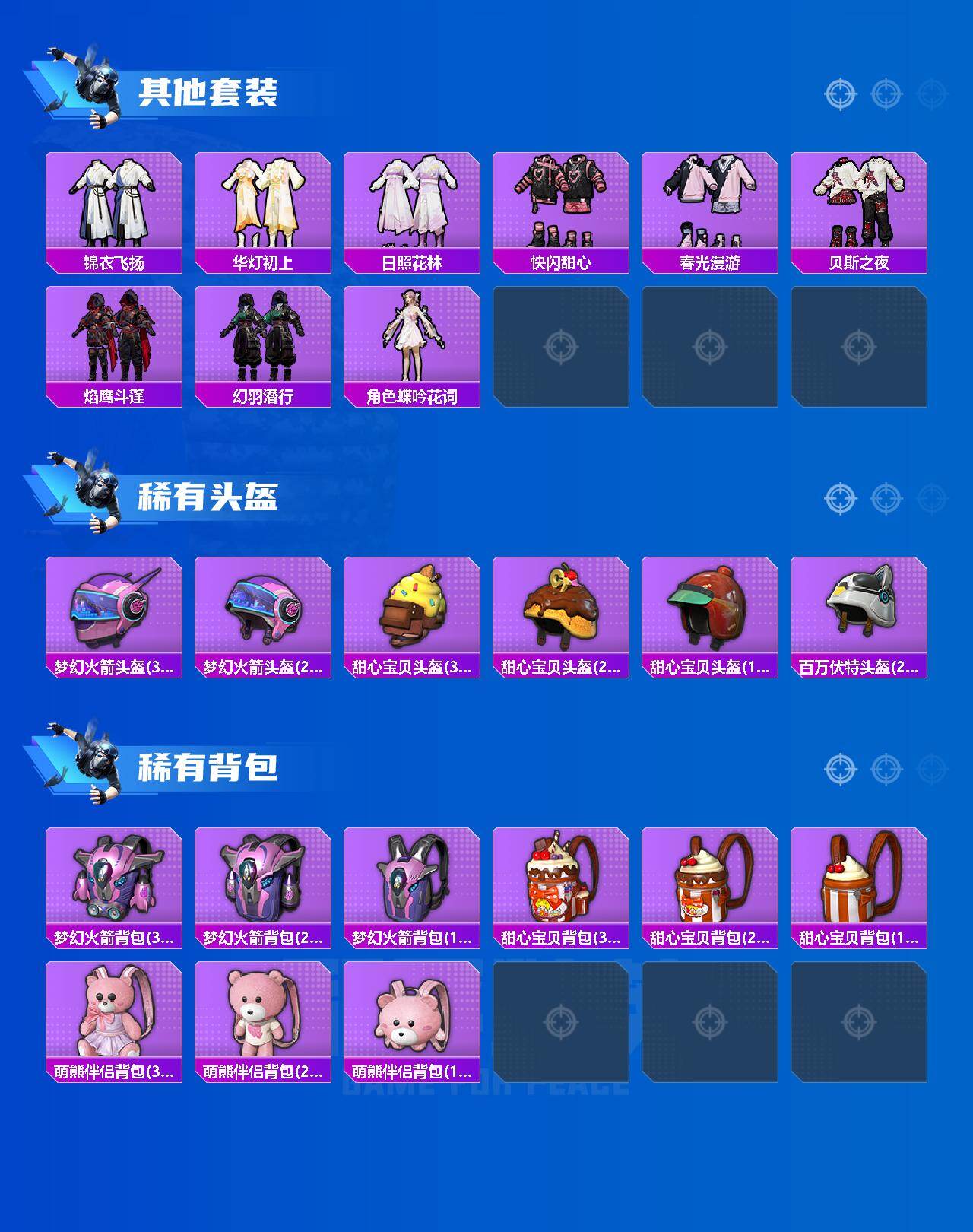 【热门品类】:粉装-梦幻火箭,套装-赤蝎幽灵,套装-派对舞王,角色-军刀雅典娜,套装-胖达圆圆,套装-金羽特工,套装-龟仙人,套装-暗影哥特,套装-粉红小猪,套装-萌熊伴侣,套装-红红火火