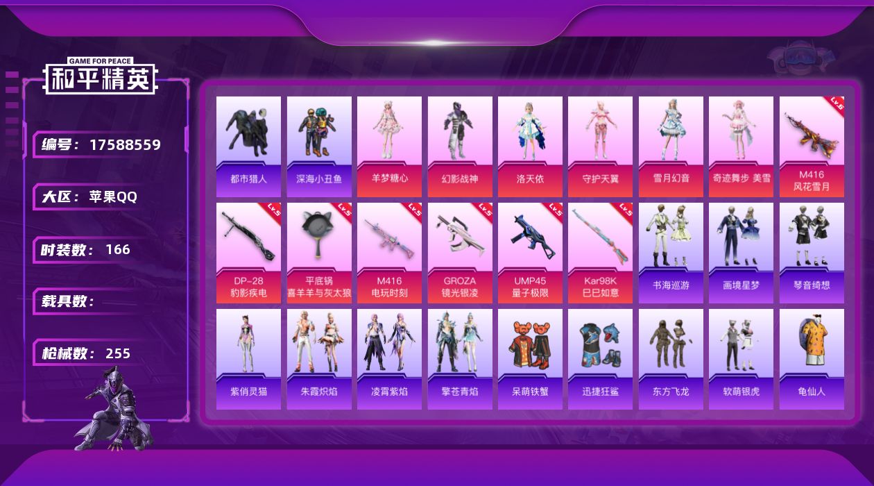 [17588559]【特价出售/店主推荐】苹果 手Q-6粉装-9特效枪-1粉色飞行器-74868热力值-10王牌印记-166套装-255枪皮【热门品类】:套装-都市猎人,套装-深海小丑鱼,套装-龟仙人,角色-Mark.06【粉色套装】:粉装-幻影战神,角色-洛天依,角色-守护天翼,粉装-雪月幻音,角色-奇迹舞步 美雪,角色-羊梦糖心【粉色枪皮等级】:M416-风花雪月(六级),M416-电玩时刻(五级),GROZA-镜光银凌(五级),ACE32-萌骑漫游(二级),UMP45-量子极限(五级),Kar98K-巳巳如意(五级),Mk14-福马献瑞(五级),DP-28-豹影疾电(五级),平底锅-喜羊羊与灰太狼(六级)【粉色枪皮】:M416-风花雪月,M416-电玩时刻,GROZA-镜光银凌,ACE32-萌骑漫游,UMP45-量子极限,Kar98K-巳巳如意,Mk14-福马献瑞,DP-28-豹影疾电,平底锅-喜羊羊与灰太狼【粉色飞行器】:炫彩糖果飞行器
