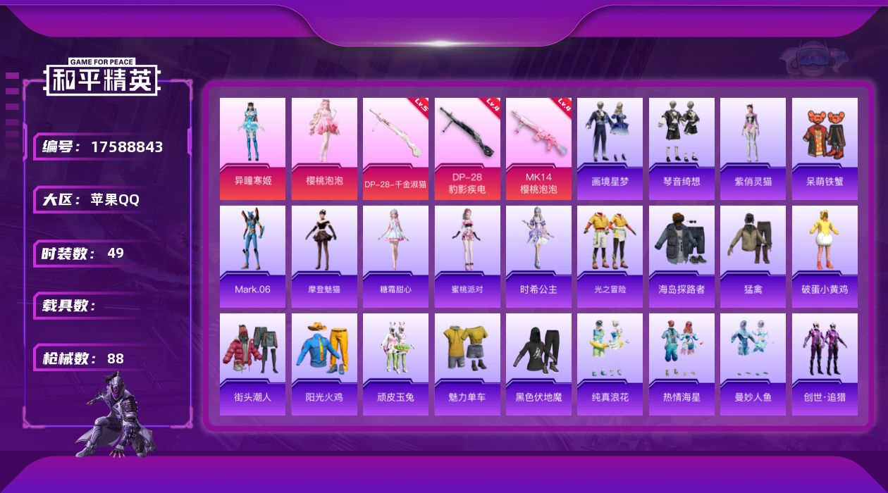 [17588843]【特价出售/店主推荐】苹果 手Q-2粉装-5特效枪-1粉色飞行器-22511热力值-1王牌印记-49套装-88枪皮【热门品类】:角色-Mark.06【粉色套装】:角色-樱桃泡泡,角色-异瞳寒姬【粉色枪皮等级】:UMP45-萌骑冒险(三级),Mk14-樱桃泡泡(四级),Mk14-福马献瑞(三级),DP-28-千金淑猫(五级),DP-28-豹影疾电(四级)【粉色枪皮】:UMP45-萌骑冒险,Mk14-樱桃泡泡,Mk14-福马献瑞,DP-28-千金淑猫,DP-28-豹影疾电【粉色飞行器】:炫彩糖果飞行器
