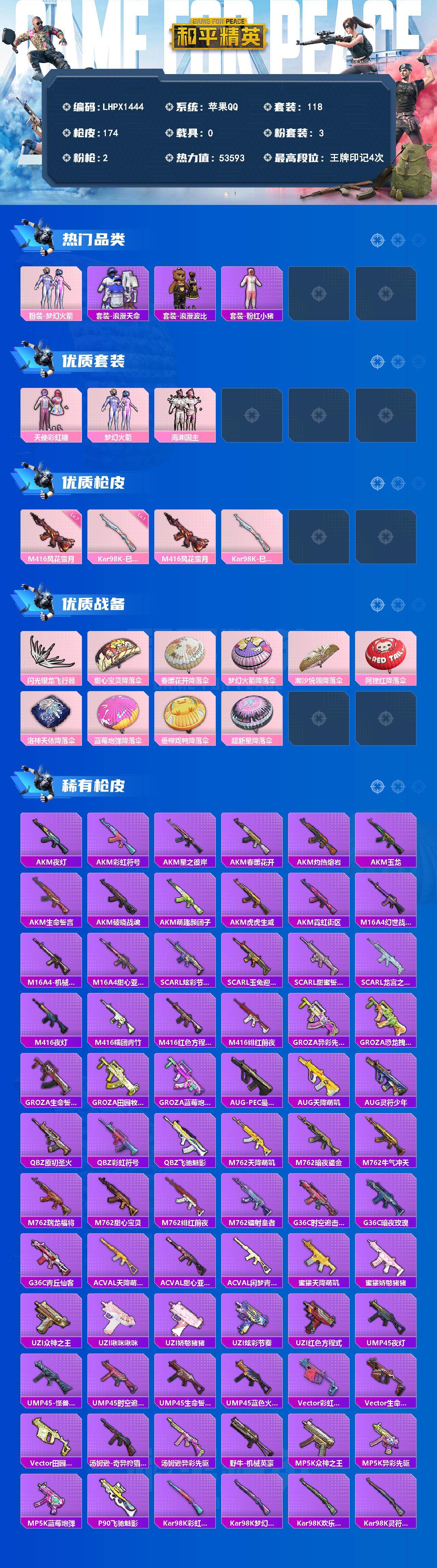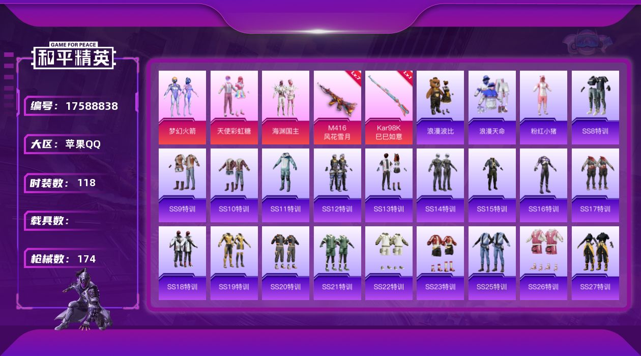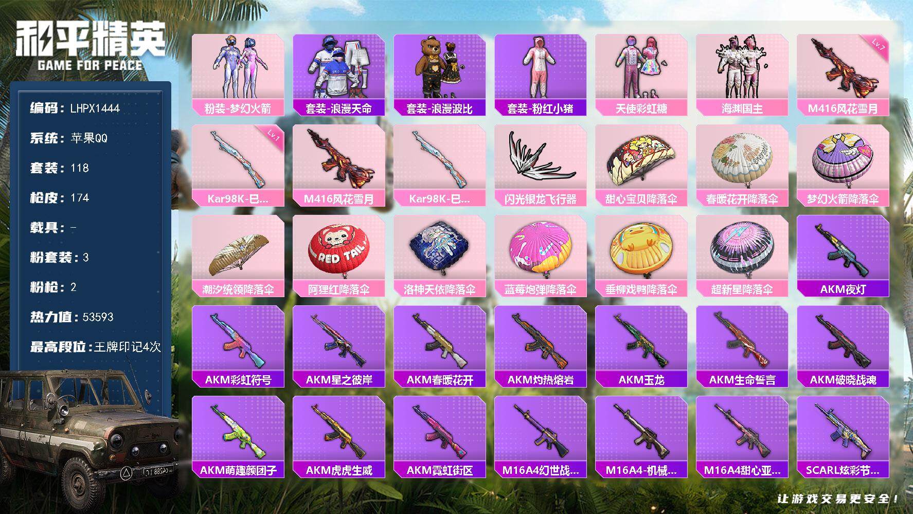 [17588838]可二次【特价出售/店主推荐】苹果 手Q-3粉装-2特效枪-1粉色飞行器-53593热力值-4王牌印记-118套装-174枪皮【热门品类】:粉装-梦幻火箭,套装-浪漫天命,套装-浪漫波比,套装-粉红小猪【粉色套装】:粉装-天使彩虹糖,粉装-梦幻火箭,粉装-海渊国主【粉色枪皮等级】:M416-风花雪月(七级),Kar98K-巳巳如意(一级)【粉色枪皮】:M416-风花雪月,Kar98K-巳巳如意【粉色飞行器】:闪光银龙飞行器