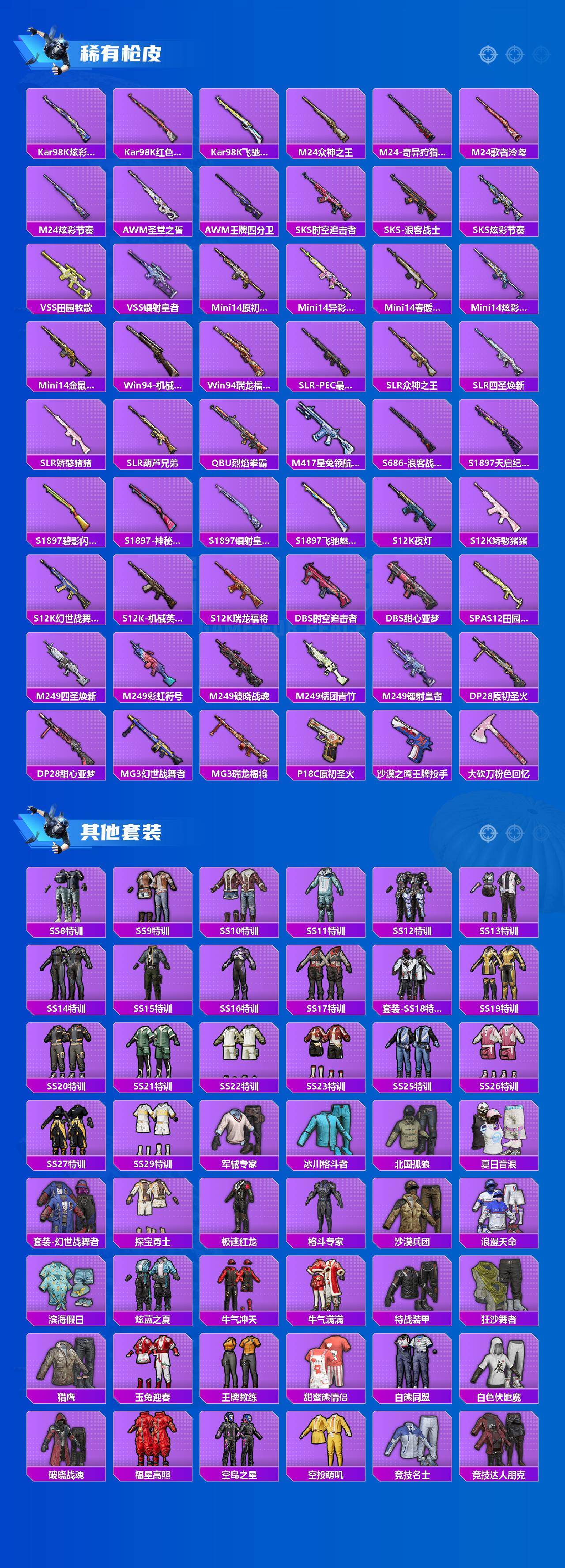 - [15579164]【店主推荐捡漏号!可直接换绑】苹果 手Q-15粉装-9特效枪-3载具-4粉色飞行器-108933热力值-17王牌印记-238套装-328枪皮【热门品类】:粉装-雪国幻梦,套装-SS1特训,套装-龟仙人,套装-粉红小猪,角色-Mark.06【粉色套装】:粉装-甜心巧克力,粉装-宝贝奶油派,粉装-天使彩虹糖,粉装-雪国幻梦,角色-洛天依,角色-复仇流浪者,粉装-第五大道,角色-白勺歌姬,角色-小可学妹,角色-星梦奇缘,角色-初号机 觉醒Ver.,粉装-金丰海韵,角色-凤凰座 一辉,粉装-星穹咏叹调,角色-罗征【粉色枪皮等级】:AKM-甜心宝贝(七级),SCAR-L-青春物语(七级),M416-心之恋语(七级),P90-金丰海韵(七级),Kar98K-巳巳如意(五级),MK20-H-海螺星光(七级),DP-28-豹影疾电(五级),平底锅-仲夏莫吉托(七级)【粉色载具】:玛莎拉蒂Ghibli(粉),保时捷918 Spyder(液态银),星梦玉骢【粉色枪皮】:AKM-甜心宝贝,SCAR-L-青春物语,M416-心之恋语,P90-金丰海韵,Kar98K-巳巳如意,MK20-H-海螺星光,DP-28-豹影疾电,平底锅-仲夏莫吉托,破片手榴弹-秋玉花灯