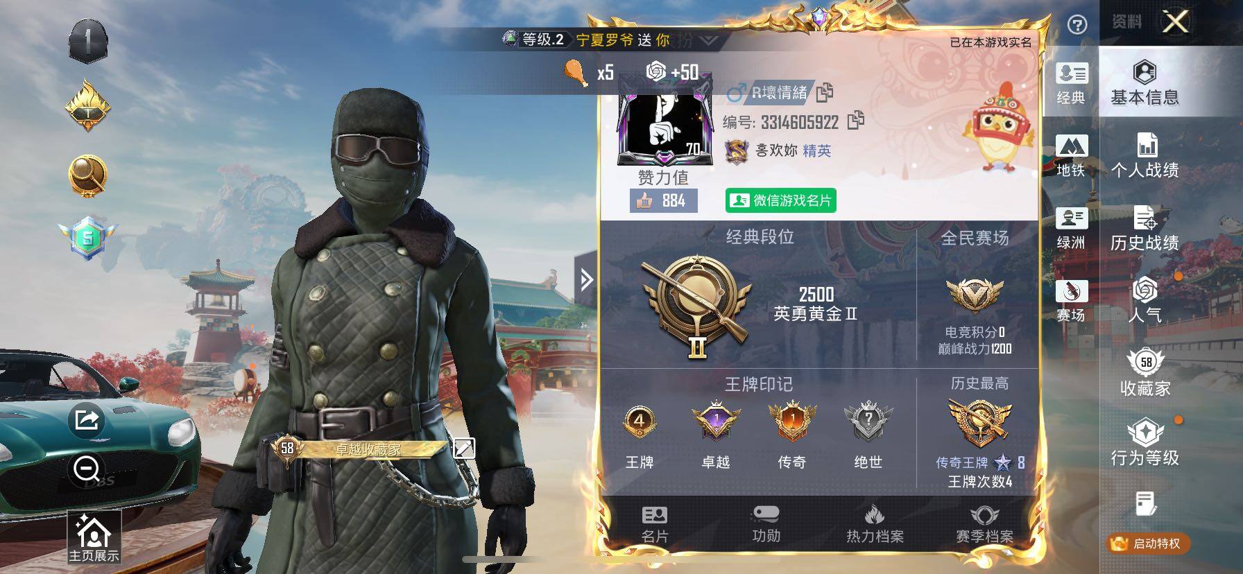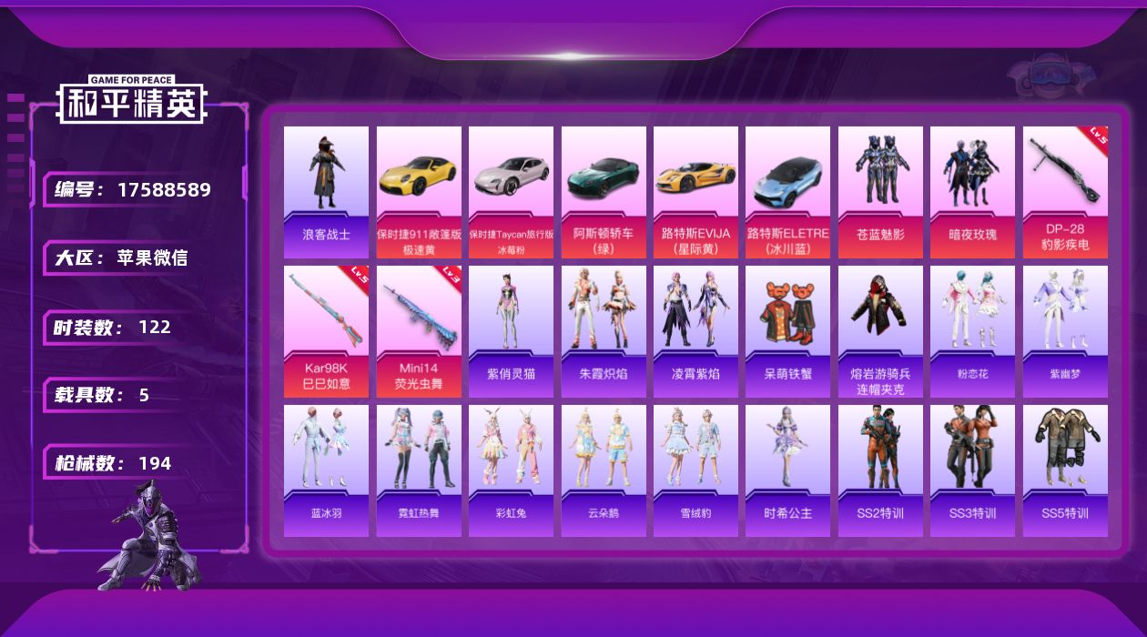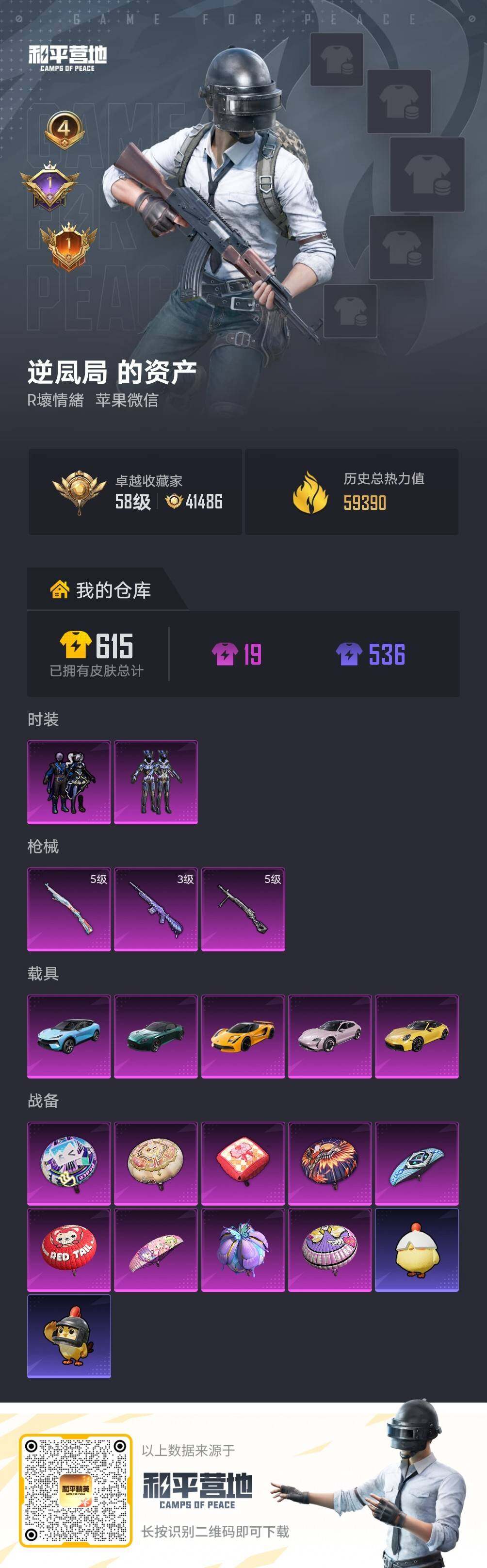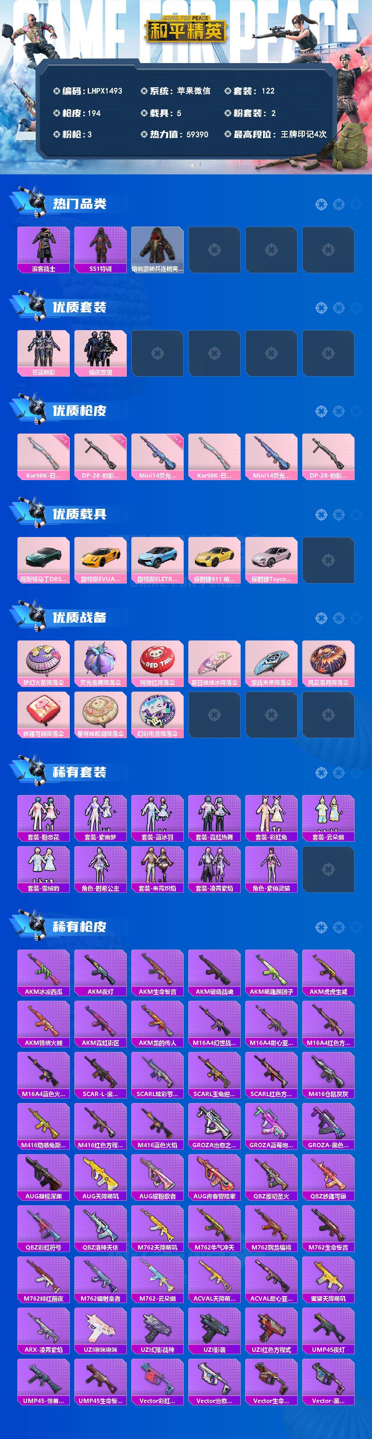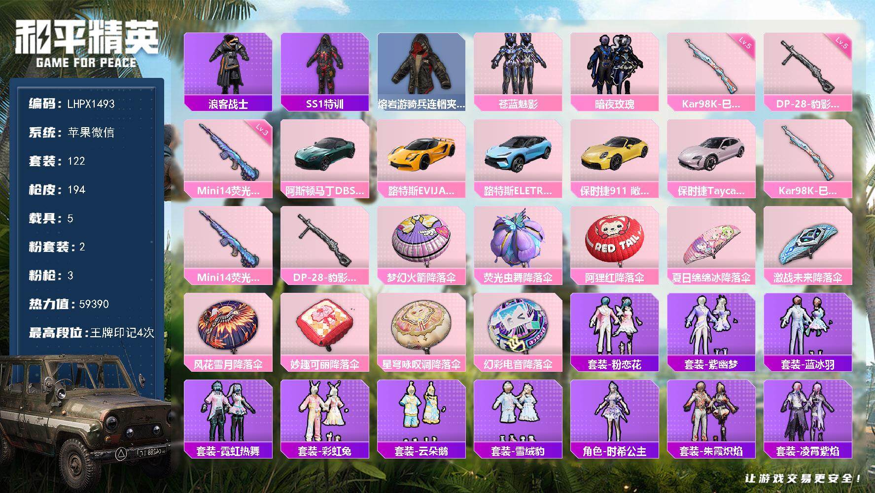 [17588589]苹果 微信-2粉装-3特效枪-5载具-59390热力值-4王牌印记-122套装-194枪皮【热门品类】:套装-浪客战士,套装-SS1特训,熔岩游骑兵连帽夹克【粉色套装】:粉装-苍蓝魅影,粉装-暗夜玫瑰【粉色枪皮等级】:Kar98K-巳巳如意(五级),Mini14-荧光虫舞(三级),DP-28-豹影疾电(五级)【粉色载具】:阿斯顿马丁DBS(绿),路特斯EVIJA(星际黄),路特斯ELETRE(冰川蓝),保时捷911 敞篷版(极速黄),保时捷Taycan 旅行版(冰莓粉)