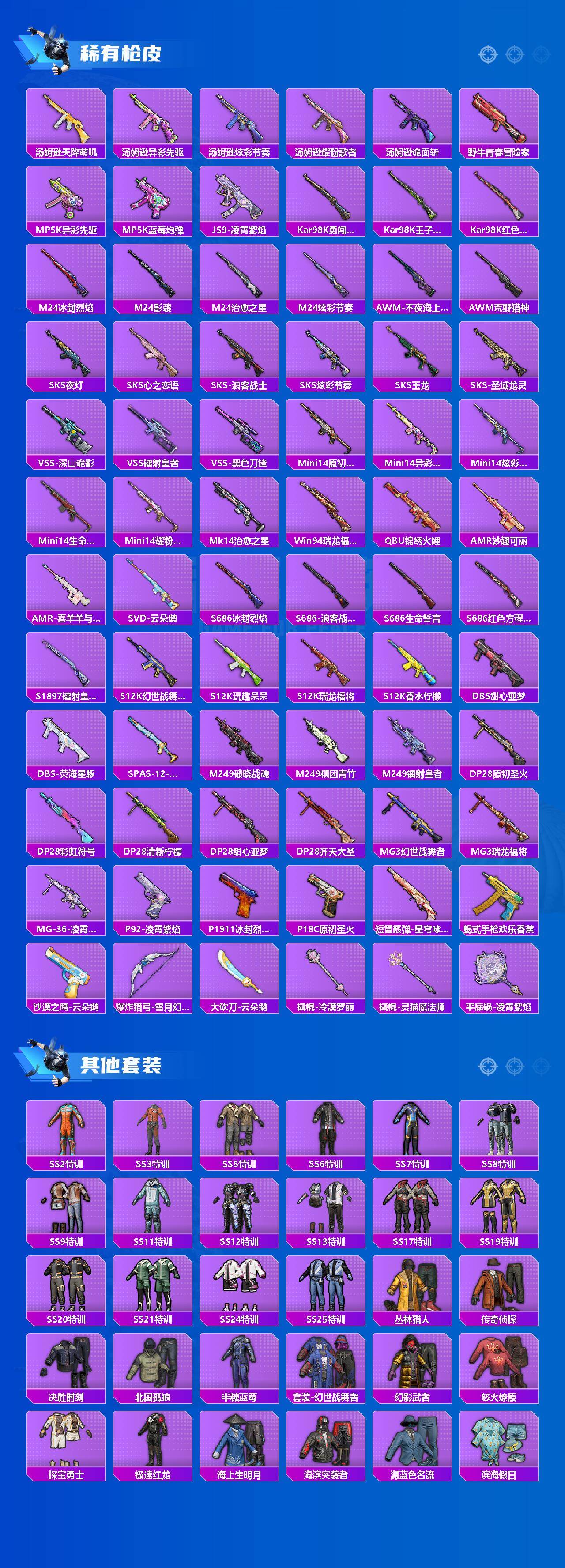 - [16772541]安卓 手Q-4粉装-9特效枪-0载具-2粉色飞行器-69834热力值-12王牌印记-186套装-250枪皮 【热门品类】:套装-浪漫天命,套装-深海小丑鱼,套装-小丑鱼,套装-忍者信条,套装-龟仙人,套装-暗影哥特,角色-Mark.06 【粉色套装】:角色-绝对恒星,角色-圣堂之誓,角色-智耀战神,角色-异瞳寒姬 【粉色枪皮等级】:GROZA-镜光银凌(五级),AUG-暖羊咩咩(五级),AUG-圣斗士星矢(七级),M762-青锋波束(五级),AKS-74U-森灵之息(五级),Kar98K-巳巳如意(五级),Mk14-精灵梦叶罗丽(七级),DP-28-豹影疾电(五级) 【粉色枪皮】:GROZA-镜光银凌,AUG-暖羊咩咩,AUG-圣斗士星矢,M762-青锋波束,AKS-74U-森灵之息,Kar98K-巳巳如意,Mk14-精灵梦叶罗丽,Mk14-福马献瑞,DP-28-豹影疾电 【粉色飞行器】:炫彩糖果飞行器,齐天大圣飞行器 【粉色降落伞】:绝对恒星降落伞,快乐主宰降落伞,幻影战神降落伞,垂柳戏鸭降落伞,旋转彩虹降落伞,飒粉甜心降落伞,未来歌姬降落伞,萌物绒绒降落伞,蜜语绒猫降落伞,精灵梦叶罗丽降落伞,初号机 觉醒Ver.降落伞,临安公主降落伞,无垠阁降落伞,喜羊羊与灰太狼降落伞,异瞳寒姬降落伞,炫彩糖果降落伞 【稀有套装】:套装-龟仙人,套装-小鸟芋圆,角色-甜心蒙太奇,套装-雪国风尚,套装-炫彩糖果,套装-雏菊兔兔,套装-萝兰蝴蝶,套装-小熊娃娃,角色-达芬奇,套装-糖糖葫芦,套装-青团波波,套装-燕燕于飞,套装-鱼渊荷华,角色-风玲,角色-海琴烟,套装-紫幽梦,套装-蓝冰羽,套装-霓虹热舞,套装-彩虹兔,套装-云朵鹅,套装-雪绒豹,角色-灵公主,套装-朱霞炽焰,套装-凌霄紫焰,套装-擎苍青焰,角色-紫俏灵猫,套装-书海巡游,套装-画境星梦,套装-琴音绮想,套装-红釉青花 【稀有枪皮】:AUG-冰晶雪宝,AKM-彩虹符号,AKM-江南烟雨,AKM-生命誓言,AKM-破晓战魂,AKM-虎虎生威,AKM-龙的传人,M16A4-幻世战舞者,SCAR-L-夜灯,SCAR-L-玉兔迎春,SCAR-L-红色方程式,SCAR-L-黄金龙骨,M416-糯团青竹,M416-红色方程式,M416-蓝色火焰,GROZA-异彩先驱,GROZA-影袭,AUG-天降萌叽,AUG-幻影战神,AU
