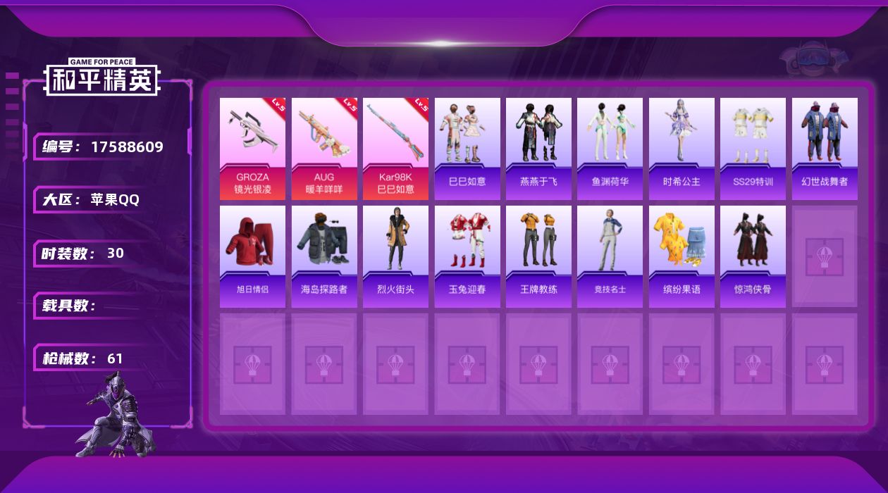 [17588609]可二次【特价出售/店主推荐】苹果 手Q-3特效枪-1粉色飞行器-15214热力值-1王牌印记-30套装-61枪皮【粉色枪皮等级】:GROZA-镜光银凌(五级),AUG-暖羊咩咩(五级),Kar98K-巳巳如意(五级)【粉色枪皮】:GROZA-镜光银凌,AUG-暖羊咩咩,Kar98K-巳巳如意【粉色飞行器】:炫彩糖果飞行器