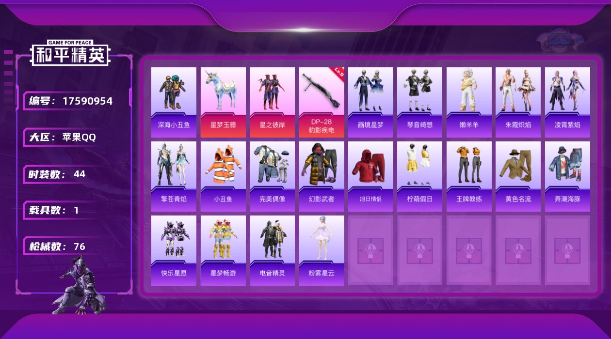 [17590954]【店主推荐捡漏号!可直接换绑】苹果 手Q-1粉装-2特效枪-1载具-2粉色飞行器-20946热力值-3王牌印记-44套装-76枪皮