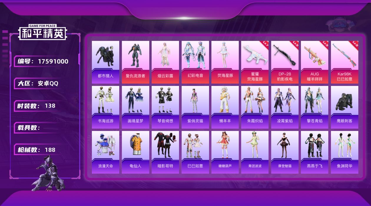 [17591000]【店主推荐捡漏号!可直接换绑】安卓 手Q-4粉装-7特效枪-0载具-1粉色飞行器-58496热力值-10王牌印记-138套装-188枪皮【热门品类】:套装-浪漫天命,套装-都市猎人,套装-龟仙人,套装-暗影哥特【粉色套装】:角色-复仇流浪者,角色-烟云彩露,粉装-幻彩电音,角色-荧海星豚【粉色枪皮等级】:AUG-暖羊咩咩(五级),蜜獾-荧海星豚(七级),UMP45-萌骑冒险(五级),AKS-74U-森灵之息(五级),Kar98K-巳巳如意(五级),Mk14-福马献瑞(五级),DP-28-豹影疾电(五级)【粉色枪皮】:AUG-暖羊咩咩,蜜獾-荧海星豚,UMP45-萌骑冒险,AKS-74U-森灵之息,Kar98K-巳巳如意,Mk14-福马献瑞,DP-28-豹影疾电