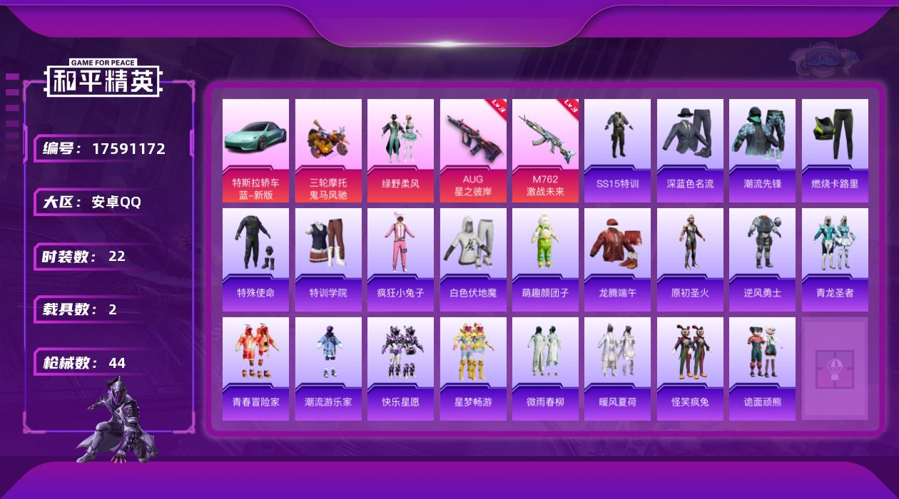 [17591172]安卓 手Q-1粉装-2特效枪-2载具-1粉色飞行器-16379热力值-0王牌印记-22套装-44枪皮【粉色套装】:粉装-绿野柔风【粉色枪皮等级】:AUG-星之彼岸(三级),M762-激战未来(三级)【粉色载具】:特斯拉Roadster(水滴蓝),鬼马风驰【粉色枪皮】:AUG-星之彼岸,M762-激战未来【粉色飞行器】:相思残雪飞行器
