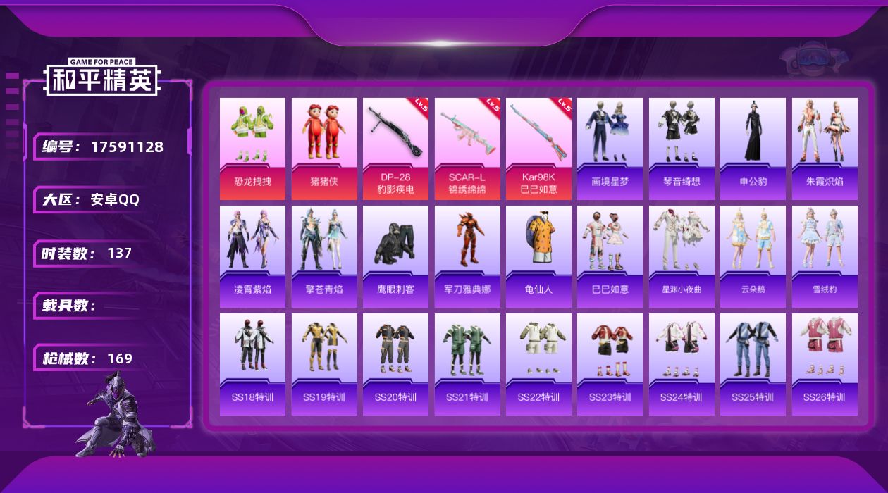 [17591128]可二次【特价出售/店主推荐】安卓 手Q-2粉装-5特效枪-1粉色飞行器-46622热力值-12王牌印记-137套装-169枪皮【热门品类】:角色-军刀雅典娜,套装-龟仙人【粉色套装】:粉装-恐龙拽拽,玩偶服-猪猪侠【粉色枪皮等级】:SCAR-L-锦绣绵绵(五级),AKS-74U-森灵之息(五级),Kar98K-巳巳如意(五级),Mk14-福马献瑞(四级),DP-28-豹影疾电(五级)【粉色枪皮】:SCAR-L-锦绣绵绵,AKS-74U-森灵之息,Kar98K-巳巳如意,Mk14-福马献瑞,DP-28-豹影疾电【粉色飞行器】:炫彩糖果飞行器