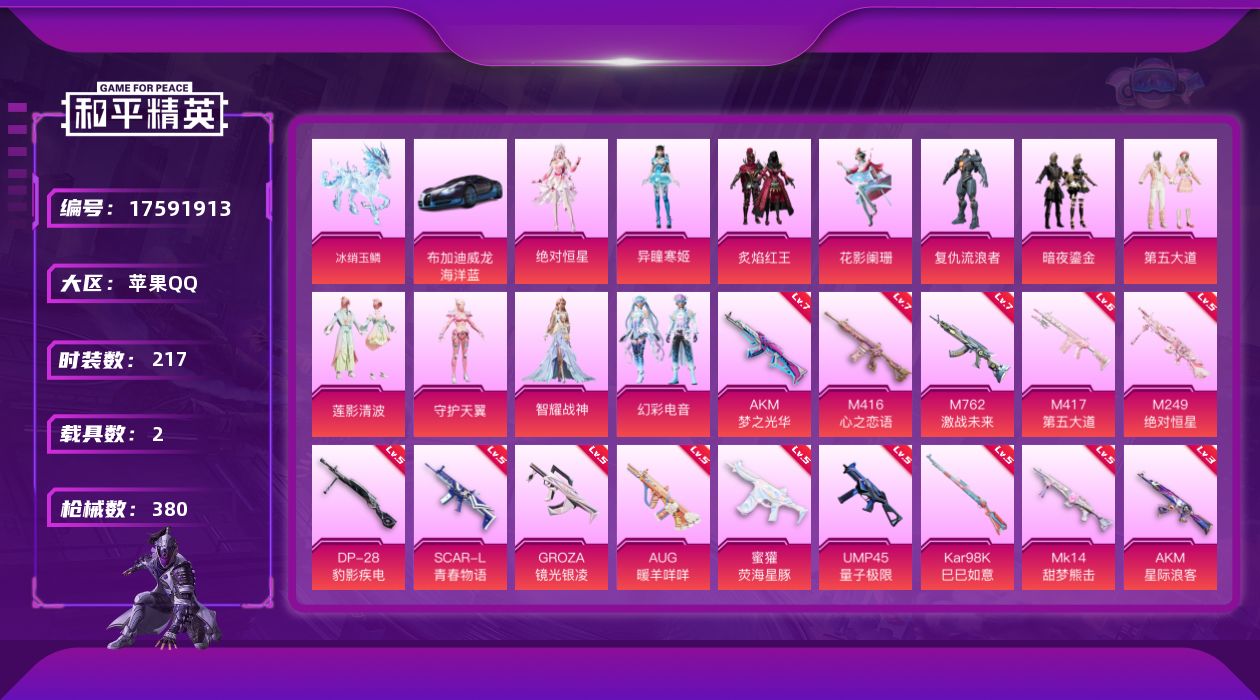 苹果 手Q-无敌战神框-11粉装-19特效枪-2载具-16粉色飞行器-117551热力值-21王牌印记-217套装-380枪皮