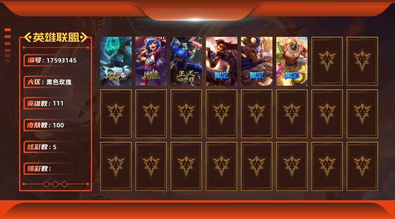 [17593145]未定级段位-111英雄-100皮肤-5炫彩-0终极-2神话-8限定-11传说-26史诗