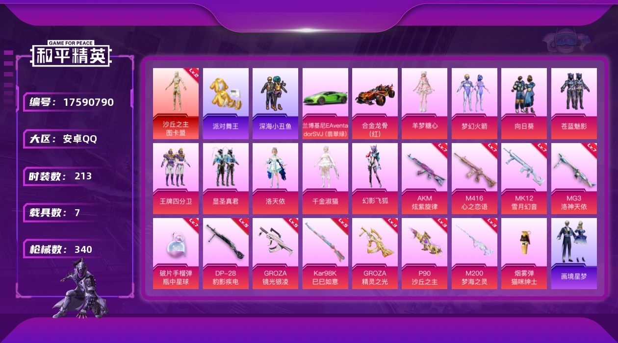 - [15156024]【店主推荐捡漏号!可直接换绑】安卓 手Q-8粉装-9特效枪-2载具-3粉色飞行器-80076热力值-16王牌印记-169套装-251枪皮 【热门品类】:角色-军刀雅典娜,套装-龟仙人 【粉色套装】:粉装-智能音符,粉装-放客神游,角色-初号机款机体服,角色-呆萌星弥,粉装-未来歌姬,角色-千金淑猫,角色-脆鲨七海,角色-冷漠罗丽 【粉色枪皮等级】:AKM-炫紫旋律(五级),SCAR-L-纯梦嫁纱(七级),M416-五爪金龙(七级),Vector-最终圣卫者(三级),P90-电糖天使(三级),Kar98K-巳巳如意(五级),M417-第五大道(六级),DP-28-豹影疾电(五级),破片手榴弹-瓶中星球(七级) 【粉色载具】:最终圣卫者摩托车,辉羽雀灵自行车 【粉色枪皮】:AKM-炫紫旋律,SCAR-L-纯梦嫁纱,M416-五爪金龙,Vector-最终圣卫者,P90-电糖天使,Kar98K-巳巳如意,M417-第五大道,DP-28-豹影疾电,破片手榴弹-瓶中星球 【粉色飞行器】:雀灵庇佑飞行器,终晖之翼飞行器