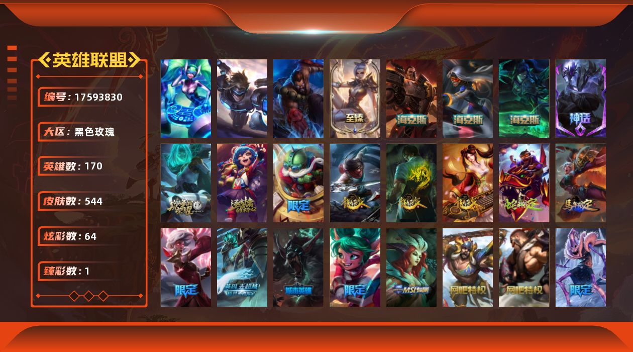 [17593830]【店主推荐捡漏号/双区多皮肤号】未定级段位-170英雄-544皮肤-64炫彩-3终极-7神话-93限定-55传说-146史诗