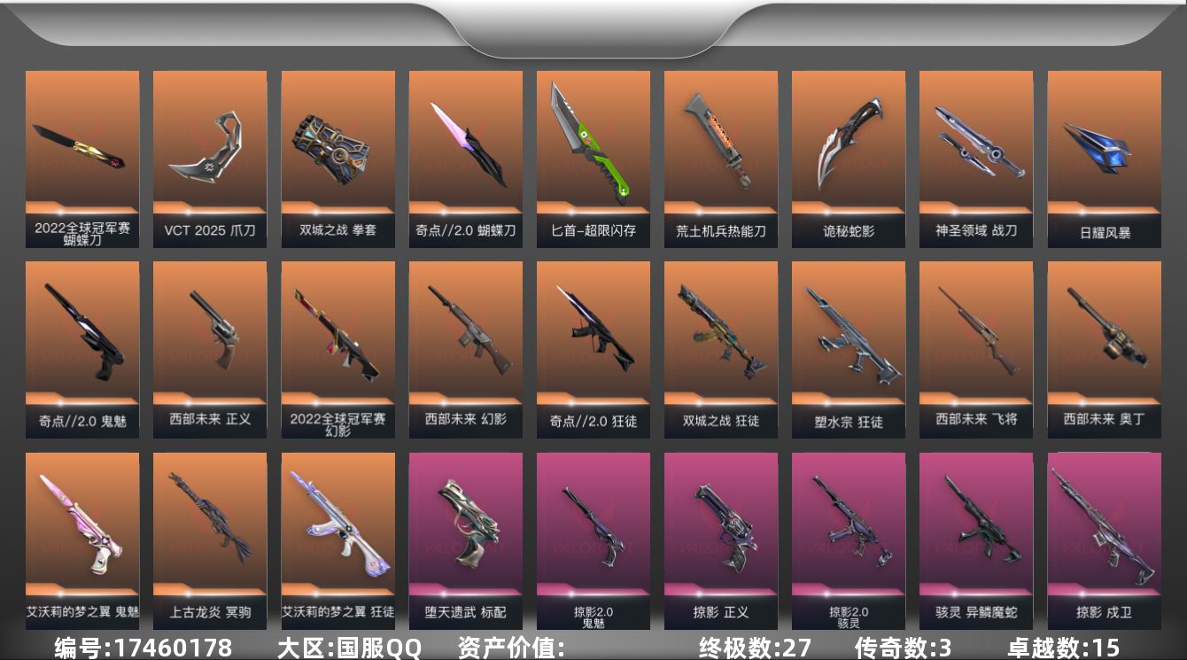 [17460178]【LXYX2】终极*27/传奇*3/卓越*15/皮肤*112/等级*108/段位:未定级/2022全球冠军赛/VCT 2025赛季礼包/西部未来/《双城之战》收藏套装/奇点//2.0套装/掠影2.0套装/掠影套装/异鳞魔蛇/幻棱/炼狱/维斯/暮蝶/钛狐/壹决/铁臂/捷风/雷兹/幽影/不死鸟/贤者/猎枭/蝰蛇/零/芮娜/奇乐/尚勃勒/霓虹/斯凯/夜露/星礈/K/O/海神/盖可/黑梦/钢锁/蝴蝶刀-2022全球冠军赛/影钩/蝴蝶刀-奇点//2.0/VCT 2025 爪刀/紫金爪刀/黑波之刃/落英飞旋/鬼丸国纲/双生獠牙/拳套-双城之战/未来开拓者/匕首-超限闪存/荒土机兵热能刀/夜刃诡镰/影刃/诡秘蛇影/神圣领域 战刀/日耀风暴/狂徒-艾沃莉的梦之翼/狂徒-奇点//2.0/狂徒-双城之战/狂徒-塑水宗/狂徒-堕天遗武/狂徒-掠影/狂徒-耀鳞威龙/狂徒-紫阙金琅/狂徒-荒土机兵/狂徒-诡秘蛇影/幻影-2022全球冠军赛/幻影-西部未来/幻影-异鳞魔蛇/幻影-掠影2.0/幻影-超限闪存/幻影-神圣领域/幻影-纳米打击/幻影-末日之翼/戍卫-掠影/戍卫-浮光跃金/戍卫-逆冲蛮牛/戍卫-月球哨兵/戍卫-折光棱晶/獠犬-神圣领域/獠犬-模拟赫兹/獠犬-逆冲蛮牛/冥驹-上古龙炎/冥驹-堕天遗武/冥驹-掠影/冥驹-荒土机兵/冥驹-模拟赫兹/冥驹-星云暗涌/飞将-西部未来/飞将-末日之翼/莽侠-超限闪存/莽侠-诡秘蛇影/莽侠-月球哨兵/战神-神圣领域/战神-浮光跃金/奥丁-西部未来/奥丁-掠影2.0/奥丁-纳米打击/奥丁-末日之翼/判官-诡秘蛇影/判官-纳米打击x/雄鹿-模拟赫兹/雄鹿-逆冲蛮牛/雄鹿-月球哨兵/骇灵-异鳞魔蛇/骇灵-掠影2.0/骇灵-荒土机兵/骇灵-浮光跃金/骇灵-星云暗涌/蜂刺-超限闪存/蜂刺-星云暗涌/蜂刺-折光棱晶/标配-堕天遗武/标配-荒土机兵/标配-浮光跃金/标配-折光棱晶/正义-西部未来/正义-掠影/正义-超限闪存/正义-纳米打击/正义-月球哨兵/鬼魅-艾沃莉的梦之翼/鬼魅-奇点//2.0/鬼魅-掠影2.0/鬼魅-诡秘蛇影/鬼魅-模拟赫兹/鬼魅-星云暗涌/狂怒-神圣领域/狂怒-逆冲蛮牛/短炮-末日之翼/终章:激斗汉堡 卡面/进入射程 卡面/分崩离析 卡面/纳米打击 卡面/抑制技术 卡面/激斗汉堡 卡面/瓦娃脸雪糕 P2 卡面/从黄昏到黎明 卡面/荒土机兵
