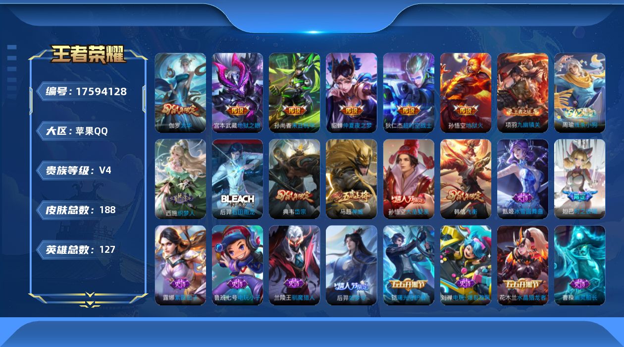 - [12152609]【商品标题】:苹果WX-V4-至尊星耀II段位-124英雄-215皮肤-2典藏-0珍品无双-0无双-3珍品传说-13传说-69史诗 【荣耀典藏】:李白鸣剑曳影,韩信弑枪猎影 【珍品传说】:马可波罗怪盗基德,鲁班七号江户川柯南,安琪拉酷洛米之心 【传说皮肤】:妲己愿照众生和,澜愿照九州拓,桑启鸣野蒿,鲁班七号时之奇旅,兰陵王影龙天霄,孙悟空齐天大圣,百里守约碎云,赵云淬星耀世,李元芳飞鸢探春,诸葛亮时雨天司,虞姬启明星使,关羽武圣,后羿黄金射手座 【限定皮肤】:大乔绒语心约,姜子牙天穹之誓,李白谪仙醉月,狄仁杰阴阳师,赵云皇家上将,鲁班七号时之奇旅,庄周高山流水,芈月幻夜卜梦,元歌无心,典韦岱宗,狄仁杰魔术师,达摩沙漠行僧,项羽海滩派对,关羽冰锋战神,关羽武圣,兰陵王影龙天霄,兰陵王金庭之子,花木兰青春决赛季,花木兰默契交锋,孙悟空孙行者,孙悟空齐天大圣,后羿圣弓游侠,李元芳匿光侦查者,虞姬启明星使,钟馗驱傩正仪,干将莫邪真爱魔法,雅典娜黎明之约,蔡文姬繁星吟游,诸葛亮时雨天司,黄忠烈魂,黄忠火炮绅士,铠青龙志,苏烈千军破阵,梦奇顽趣,裴擒虎李小龙,裴擒虎擒涛扼浪,云中君纤云弄巧,猪八戒猪悟能,嫦娥拒霜思,鲁班大师探海日志,桑启海盐诗旅,艾琳流音漫舞,司空震地狱燃心,阿古朵江河有灵,张良古海寻踪,蒙犽百解令,高渐离燃音魔法,妲己灵卜魔法,鬼谷子天穹祈灯,伽罗琥珀纪元,姬小满妄想食味,沈梦溪龙舞盛年,刘邦剑破天穹,镜青焰无极,项羽苍威无极,刘备异域游侠,周瑜熔金海岸 【年限皮肤】:铠青龙志,诸葛亮时雨天司,典韦岱宗,马超神威,关羽武圣,黄忠烈魂 【赛季限定】:达摩沙漠行僧,兰陵王金庭之子,张良古海寻踪,钟馗驱傩正仪,雅典娜黎明之约,苏烈千军破阵,梦奇顽趣,裴擒虎擒涛扼浪,鲁班大师探海日志,桑启海盐诗旅,鬼谷子天穹祈灯,刘邦剑破天穹,姜子牙天穹之誓 【战令限定】:芈月幻夜卜梦,艾琳流音漫舞,后羿圣弓游侠,干将莫邪真爱魔法,黄忠火炮绅士,司空震地狱燃心,高渐离燃音魔法,妲己灵卜魔法,镜青焰无极,项羽苍威无极 【史诗皮肤】:露娜紫霞仙子,赵云皇家上将,貂蝉圣诞恋歌,甄姬冰雪圆舞曲,王昭君偶像歌手,狄仁杰魔术师,廉颇地狱岩魂,宫本武藏鬼剑武藏,孙尚香水果甜心,嬴政摇滚巨星,妲己魅力维加斯,墨子龙骑士,吕布圣诞狂欢,曹操幽灵船长,李白千年之狐,吕布末日机甲,关羽冰锋战神,花木兰
