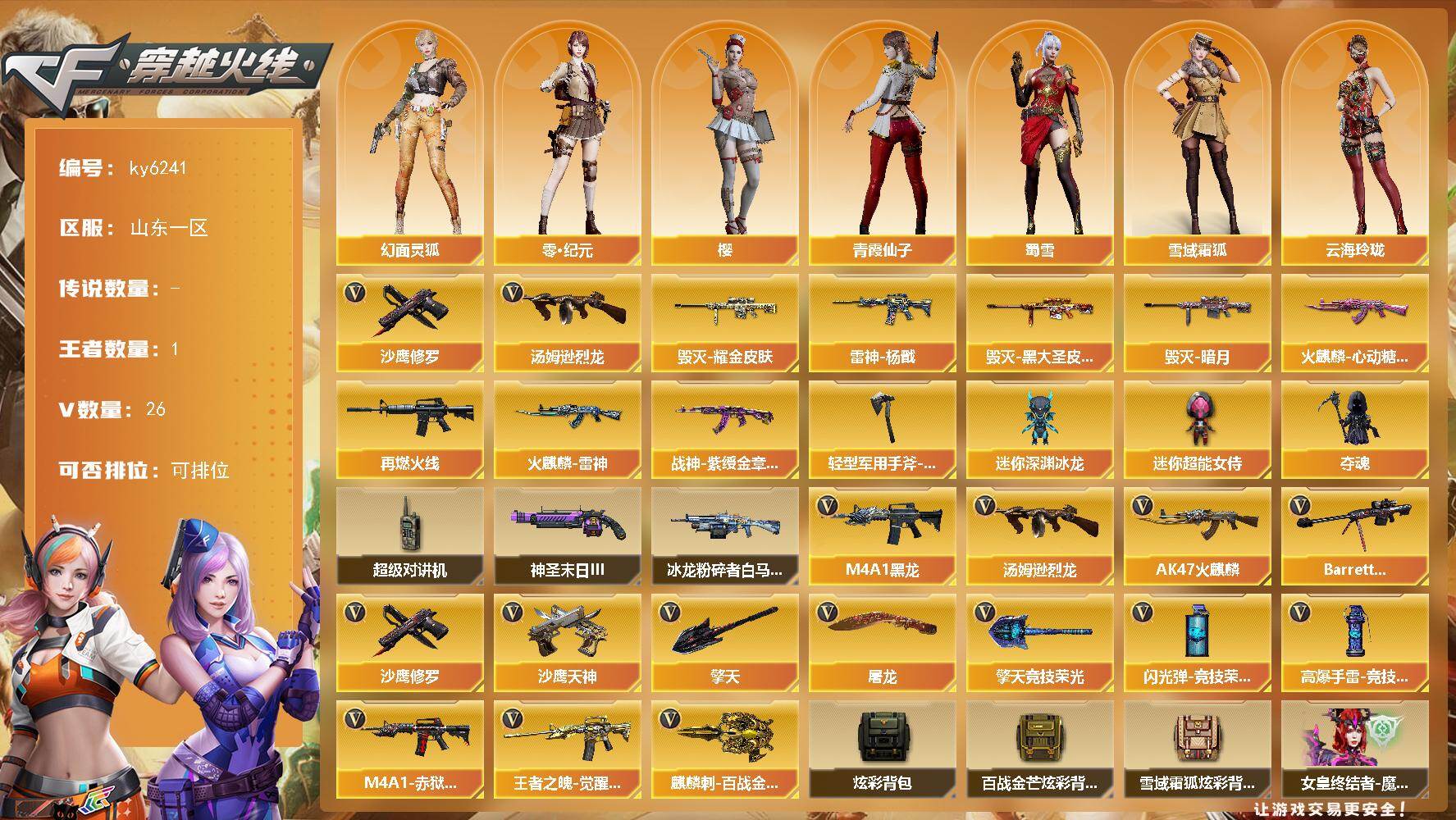 [17403957]【ky6241】山东一区-28V-1王者武器数-0炫金武器数 【热门武器】:汤姆逊-烈龙,沙鹰-修罗*3 【皮肤】:雷神-杨戬,M4A1-再燃火线,火麒麟-雷神,火麒麟-心动糖果,毁灭-暗月,毁灭耀金皮肤,毁灭-黑大圣皮肤,战神-紫绶金章皮肤,轻型军用手斧-再燃火线 【角色】:樱,零·纪元,雪域霜狐,云海玲珑,葵-阿尔法武装,幻面灵狐,暗夜-X,初恋灵狐,芳心审判者,嘉年华灵狐,娟娟,灵狐者-X,曼陀罗-X,曼陀罗-礼服,潘多拉-X,青霞仙子,斯沃特-X,蜀雪,兔囡囡,樱-战斗天使 【人偶武器】:迷你深渊冰龙,夺魂,迷你超能女侍 【暴走生化】:超级对讲机 【挑战大师】:冰龙粉碎者-白马银枪,神圣爆裂者-末日III 【英雄级武器】:AK47-火麒麟,M4A1-黑龙,王者之魄-觉醒版,机械迷城-穹宇,Barrett-毁灭,汤姆逊-烈龙,沙鹰-修罗*3,沙鹰-天神*3,屠龙,擎天,擎天-竞技荣光,麒麟刺-百战金芒,高爆手雷-竞技荣光,闪光弹-竞技荣光,M4A1-赤狱骑士 【道具】:炫彩背包,百战金芒炫彩背包,雪域霜狐炫彩背包,女皇终结者-魔龙之吻,救世主-黑桃战神,绿色巨人,灵魂忍者*2,变异宝贝,迷雾幽灵*2,生化弹匣,夺命之镰*3,防化服*3,金色流光-枪王排位,语音特效-盛典烟火,语音特效-怀旧,雪域霜狐表情,萌萌小葵表情,电玩兔兔表情,防弹头盔*3,防弹衣*3,C4工具钳*3,手雷包*3 【特殊枪械】:1烈龙